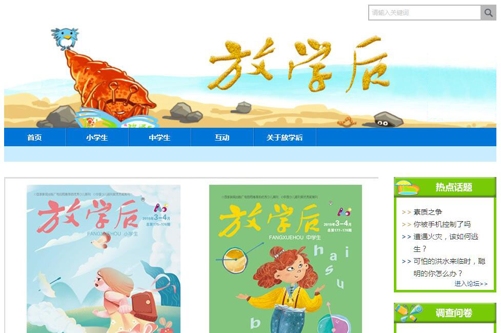 | 網(wǎng)站簡介: 放學后電子版,放學后多媒體數(shù)字報刊。《放學后》是由湖南日報報業(yè)集團主管主辦的教育類專業(yè)刊物。國內統(tǒng)一刊號CN43—1518/G4,郵發(fā)代號42-398(小學生)42-399(中學生)。為少年兒童提供融知識性、趣味性于一體的課外閱讀素材,講述成長故事,交流學習收獲,服務素質教育,傳遞人文精神,陪伴青少年快樂成長。 |
