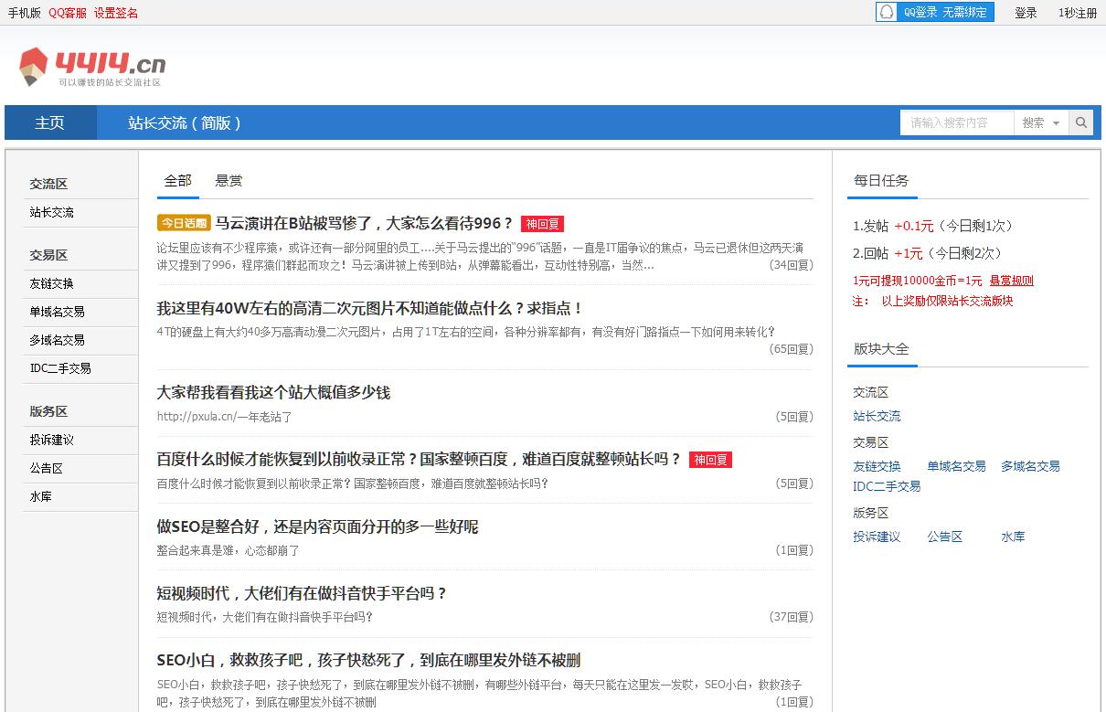 | 網(wǎng)站簡介: 4414站長論壇是可以賺錢的站長問答社區(qū),致力于站長平臺和站長論壇的建設和發(fā)展,專注于站長問題的解答以及做站人心得的交流社區(qū),努力把4414站長論壇打造成頂級的站長交流平臺。 |