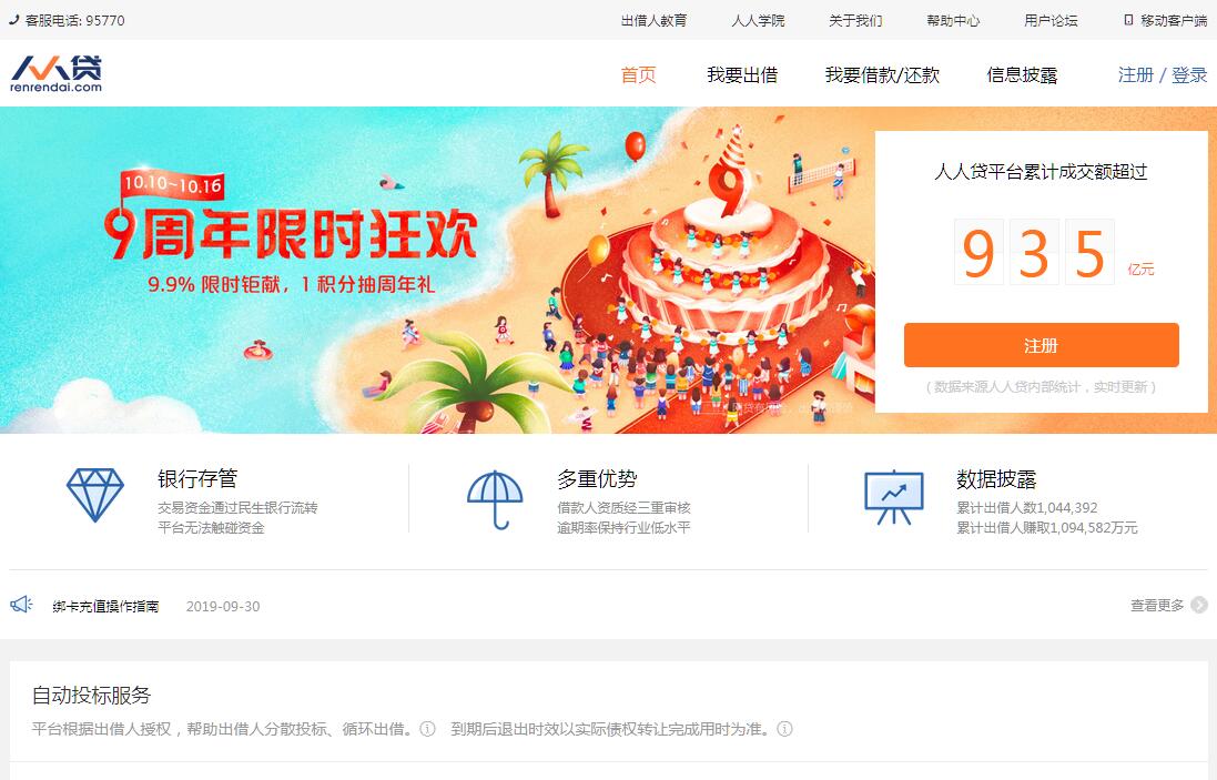 人人貸是人人友信旗下的互聯(lián)網(wǎng)金融平臺,主打個(gè)人借貸,平臺采用線上線下結(jié)合的模式,信息披露比較透明,會公布每季度的相關(guān)運(yùn)營數(shù)據(jù),方便投資人了解平臺的運(yùn)行狀況,及時(shí)預(yù)測和規(guī)避風(fēng)險(xiǎn),項(xiàng)目資金交由中國民生銀行進(jìn)行存管,設(shè)置風(fēng)險(xiǎn)準(zhǔn)備金為投資人提供100%本金保障。人人貸不僅始終堅(jiān)持小額分散人人貸始終堅(jiān)持小額分散,并于2016年2月完成銀行資金存管,是最早完成銀行資金存管的平臺之一。經(jīng)過多年的發(fā)展,人人貸的業(yè)務(wù)已覆蓋全國30余個(gè)省的2000多個(gè)地區(qū),服務(wù)超過200萬精準(zhǔn)用戶。人人貸累計(jì)成交額超過462億元(數(shù)據(jù)截止至2017年12月31日),2013年12月,人人貸母公司人人友信集團(tuán)完成1.3億美元A輪融資,創(chuàng)下當(dāng)時(shí)行業(yè)最大單筆融資記錄。2014年5月榮獲“企業(yè)信用評價(jià)AAA級信用企業(yè)”證書。2015年和2016年入圍中國互聯(lián)網(wǎng)百強(qiáng)企業(yè),曾連續(xù)4季度蟬聯(lián)中國網(wǎng)貸評價(jià)體系(中國社科院與中證金牛金融研究中心聯(lián)合組成)的AAA評級(最高級)的民營網(wǎng)貸企業(yè)。