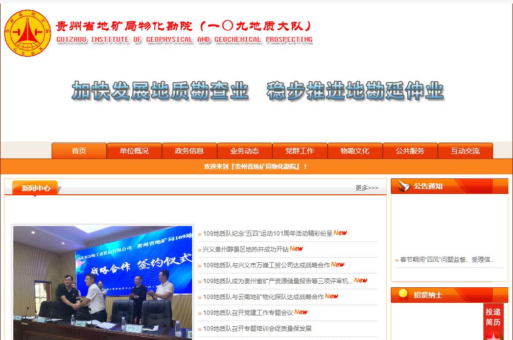 貴州省地礦局地球物理地球化學(xué)勘查院(109地質(zhì)大隊)是隸屬于貴州省地礦局的綜合性地質(zhì)勘查事業(yè)單位,從事基礎(chǔ)性、公益性及商業(yè)性固體礦產(chǎn)勘查、地球物理地球化學(xué)勘查、地質(zhì)測繪以及水文、工程、環(huán)境地質(zhì)勘察設(shè)計施工評估工作。現(xiàn)擁有固體礦產(chǎn)勘查、地球物理勘查、地球化學(xué)勘查三個甲級資質(zhì),土地規(guī)劃乙級、水文地質(zhì)工程地質(zhì)環(huán)境地質(zhì)調(diào)查乙級、液體礦產(chǎn)勘查乙級、巖土工程勘察丙級、測繪丙級、地質(zhì)災(zāi)害防治工程勘察丙級等資質(zhì)。現(xiàn)有各類大中型地質(zhì)物探、工程測量、地質(zhì)測繪等設(shè)備儀器30余臺套;在職職工196人,中高級專業(yè)技術(shù)人員51人、研究員1人。貴州省地礦局地球物理地球化學(xué)勘查院(109地質(zhì)大隊)成立于1958年,主要承擔(dān)貴州省1:20萬區(qū)域重力調(diào)查、1:20萬區(qū)域化探掃面、礦區(qū)物化探等工作,為貴州的地質(zhì)找礦特別是金礦的發(fā)現(xiàn)和勘查開發(fā)作出了重大貢獻(xiàn)。榮獲省部級以上獎項10多個,1997年原地礦部部長宋瑞祥為該院題詞:“地礦部門二次創(chuàng)業(yè)的帶頭人”、2012年獲國土資源部“抗旱打井”先進(jìn)集體等榮譽稱號。2013年,經(jīng)省政府同意,在黔西南州興義市成立109地質(zhì)大隊以來,物化勘院與109隊實行“一套班子、兩塊牌子”經(jīng)營管理模式,單位緊緊圍繞貴州省發(fā)展戰(zhàn)略目標(biāo),主動融入地方經(jīng)濟(jì)發(fā)展,充分發(fā)揮地質(zhì)找礦、物探找水、地災(zāi)防治等方面的專業(yè)技術(shù)優(yōu)勢,服務(wù)于、服從于工地方發(fā)展需求,為地方經(jīng)濟(jì)社會發(fā)展提供技術(shù)支撐。