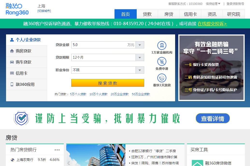 | 網(wǎng)站簡介: 融360(www.Rong360.com), 成立于2011年10月, 是中國領(lǐng)先的移動金融智選平臺。融360旗下簡普科技(NYSE:JT)于2017年11月16日在紐約證券交易所成功上市。融360致力于為個人消費(fèi)者和小微企業(yè)提供金融產(chǎn)品的搜索、推薦和申請服務(wù), 業(yè)務(wù)范圍涵蓋貸款、信用卡與理財。此外,還免費(fèi)為用戶提供便捷、劃算、安全的金融信息。融360理財頻道,中國理財門戶網(wǎng)站。為您提供全天候7X24小時及時權(quán)威的理財資訊,包括銀行理財產(chǎn)品,網(wǎng)貸投資,基金,互聯(lián)網(wǎng)理財?shù)?,為您的理財生活保駕護(hù)航。 |