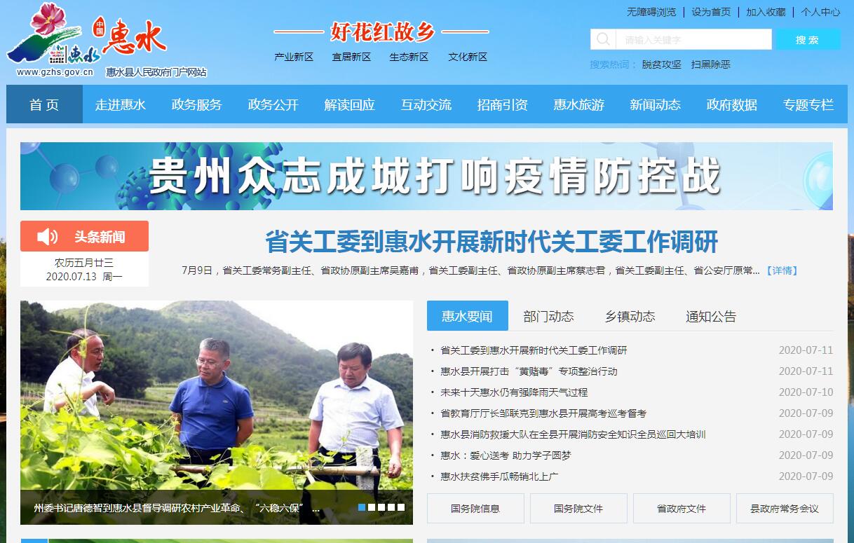 惠水縣隸屬于貴州省黔南布依族苗族自治州,位于貴州省中南部,北鄰貴陽,西及安順,縣域東西寬72公里,南北長68公里,少數(shù)民族占58%,是布依傳世民歌《好花紅》的發(fā)源地,被譽(yù)為“好花紅故鄉(xiāng)”。全縣轄8鎮(zhèn)3街道,總面積2470平方公里,聚居著漢、布依、苗、回、壯、水、白、毛南等17個(gè)民族。2019年末,全縣戶籍人口總數(shù)為47.69萬人?;菟晕宕鹪O(shè)南寧州,宋代置“八番”地,明代建程番府,定番府,自今已有一千余年的歷史。在漫長的歷史歲月里,創(chuàng)造了豐富多彩的民族文化,其中不乏蘆笙、蠟染、吊腳樓、楓香染等藝術(shù)珍品;每年的“三月三”“六月六”“糯米坡節(jié)”“端午節(jié)”等傳統(tǒng)民族特色節(jié)日,好戲連臺(tái)、精彩紛呈。特別是《好花紅》布依民歌調(diào),早在上世紀(jì)60年代就唱響祖國大江南北,現(xiàn)已成為惠水縣乃至貴州省的文化品牌,是布依文化寶庫中一顆璀璨奪目的明珠。2019年全縣實(shí)現(xiàn)地區(qū)生產(chǎn)總值113.1億元,同比增長10.8%。其中:第一產(chǎn)業(yè)實(shí)現(xiàn)增加值25.88億元,增長6.8%;第二產(chǎn)業(yè)實(shí)現(xiàn)增加值35.51億元,增長11.3%;第三產(chǎn)業(yè)實(shí)現(xiàn)增加值51.7億元,增長12.3%。2019年4月24日,貴州省人民政府正式批準(zhǔn)惠水縣退出貧困縣序列。