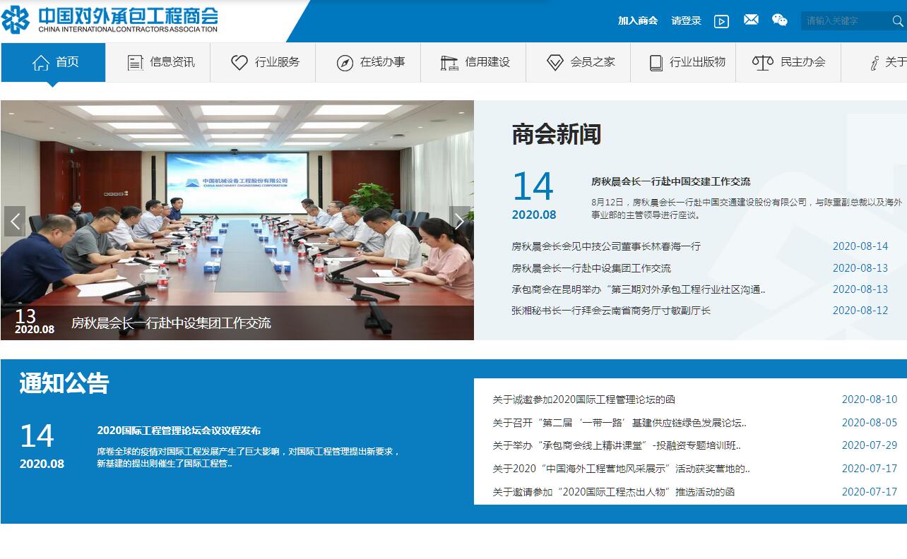 | 網(wǎng)站簡(jiǎn)介: 中國(guó)對(duì)外承包工程商會(huì)是由在中華人民共和國(guó)境內(nèi)依法注冊(cè)從事對(duì)外承包工程、勞務(wù)合作、工程類投資及提供相關(guān)服務(wù)的企業(yè)和單位依法自愿組成的全國(guó)性、行業(yè)性、非營(yíng)利性的社會(huì)組織,代表行業(yè),具有社會(huì)團(tuán)體法人資格。其主要職責(zé)是:1、代表行業(yè)利益,表達(dá)行業(yè)意愿。參與相關(guān)法律法規(guī)、產(chǎn)業(yè)政策、技術(shù)標(biāo)準(zhǔn)和行業(yè)發(fā)展規(guī)劃的制訂,向政府反映會(huì)員的合理建議。代表行業(yè)進(jìn)行對(duì)外交涉,維護(hù)會(huì)員企業(yè)及勞務(wù)人員的合法利益。2、實(shí)施行業(yè)自律,維護(hù)經(jīng)營(yíng)秩序。制定行業(yè)行為規(guī)范和公約,協(xié)調(diào)會(huì)員業(yè)務(wù)和會(huì)員關(guān)系,開展行業(yè)信用體系和社會(huì)責(zé)任建設(shè),維護(hù)國(guó)家利益,維護(hù)經(jīng)營(yíng)秩序,保護(hù)公平競(jìng)爭(zhēng)。3、開展專業(yè)服務(wù),滿足企業(yè)需求。開展行業(yè)研究,提供信息、咨詢、培訓(xùn)服務(wù),協(xié)助企業(yè)解決業(yè)務(wù)問(wèn)題,組織市場(chǎng)考察和開拓活動(dòng)。4、加強(qiáng)國(guó)際交流,促進(jìn)同行合作。代表本行業(yè)參加國(guó)際同行業(yè)組織,出席有關(guān)國(guó)際會(huì)議,與相關(guān)國(guó)際組織和地區(qū)、國(guó)家同行業(yè)組織建立聯(lián)系,促進(jìn)行業(yè)的國(guó)際間合作。5、履行政府委托的、會(huì)員共同要求的及行業(yè)發(fā)展所需要的其他職責(zé)。 |