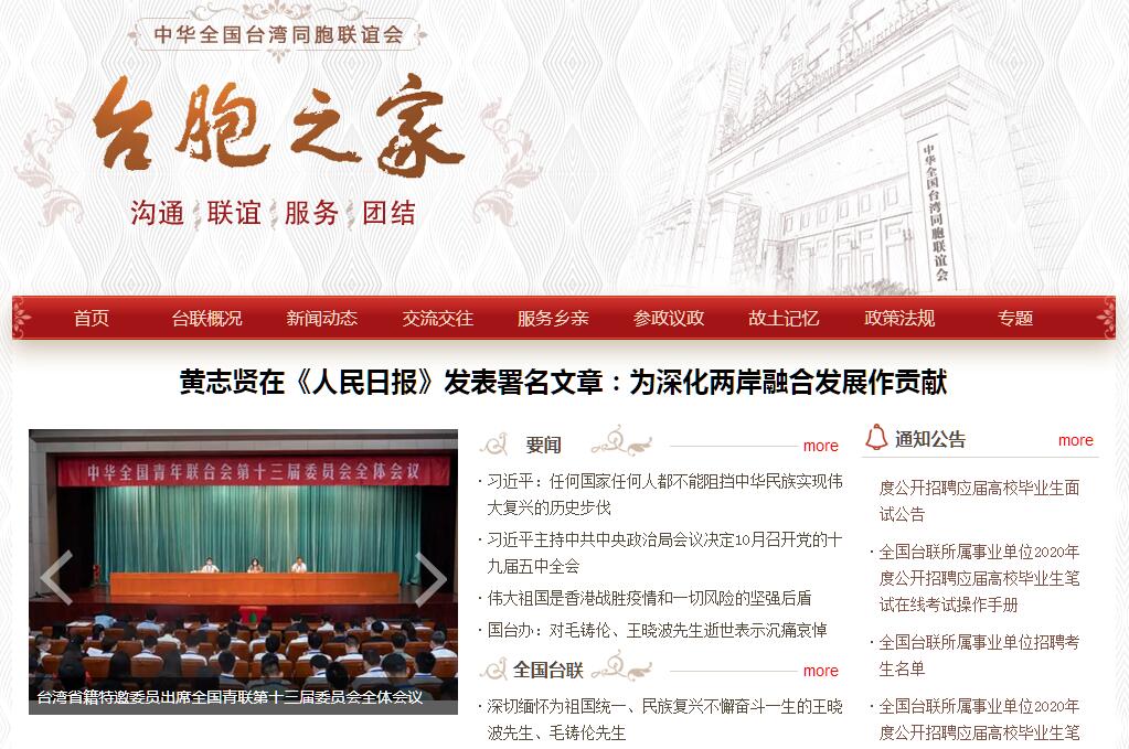 中華全國臺灣同胞聯(lián)誼會(簡稱全國臺聯(lián))于1981年12月22日在北京成立,是臺灣各族同胞的愛國民眾團體。全國臺聯(lián)是臺灣各族同胞的愛國民眾團體,是黨和政府聯(lián)系臺灣同胞的橋梁和紐帶。其宗旨繼承和發(fā)揚臺灣同胞光榮的愛國愛鄉(xiāng)傳統(tǒng),高舉社會主義、愛國主義旗幟,牢牢把握兩岸關(guān)系和平發(fā)展主題,密切聯(lián)系居住在祖國大陸的臺灣同胞;在愛國統(tǒng)一的旗幟下,廣泛團結(jié)聯(lián)絡臺灣島內(nèi)、港澳和海外的臺灣同胞,同心同德,為增進鄉(xiāng)親情誼和臺灣人民福祉,為推動兩岸關(guān)系和平穩(wěn)定發(fā)展,為按照“和平統(tǒng)一、一國兩制”的方針實現(xiàn)祖國統(tǒng)一,為振興中華、促進中華民族大團結(jié)而貢獻力量 全國臺聯(lián)團結(jié)依靠定居祖國大陸的臺灣同胞,協(xié)助他們了解政府的方針政策和臺灣局勢;鼓勵他們充分發(fā)揮聰明才智,積極參政議政,為祖國統(tǒng)一和中國特色社會主義建設(shè)多做貢獻;了解和反映他們的意見和要求,配合有關(guān)部門按照法律和政策妥善處理。關(guān)心和協(xié)助定居祖國大陸的臺灣同胞返鄉(xiāng)探親、掃墓、訪友、定居和進行經(jīng)濟、科技、文化、學術(shù)、體育等交流。全國臺聯(lián)加強與臺灣島內(nèi)同胞的聯(lián)系,傾聽和反映他們的意見和要求,充分理解他們當家作主的愿望,維護他們的正當權(quán)益,積極發(fā)揮橋梁和紐帶作用。密切聯(lián)系常住祖國大陸的臺灣同胞,幫助他們了解和理解祖國大陸的法律法規(guī)和有關(guān)方針政策,協(xié)助他們在祖國大陸投資、求學、就業(yè)、興辦公益慈善事業(yè),認真聽取和反映他們的意見和建議,維護他們的合法權(quán)益。全國臺聯(lián)發(fā)展同香港、澳門及旅居海外的臺灣同胞及其社會團體的聯(lián)誼關(guān)系,相互溝通,增進共識。目前,祖國大陸除西藏以外的31個省、自治區(qū)、直轄市(含兵團)和臺胞比較集中的地、市和縣都已建立了地方臺聯(lián)。隨著海峽兩岸往來的日益增多,作為臺胞之家的臺聯(lián)將一如既往熱情周到地為臺灣同胞服務。