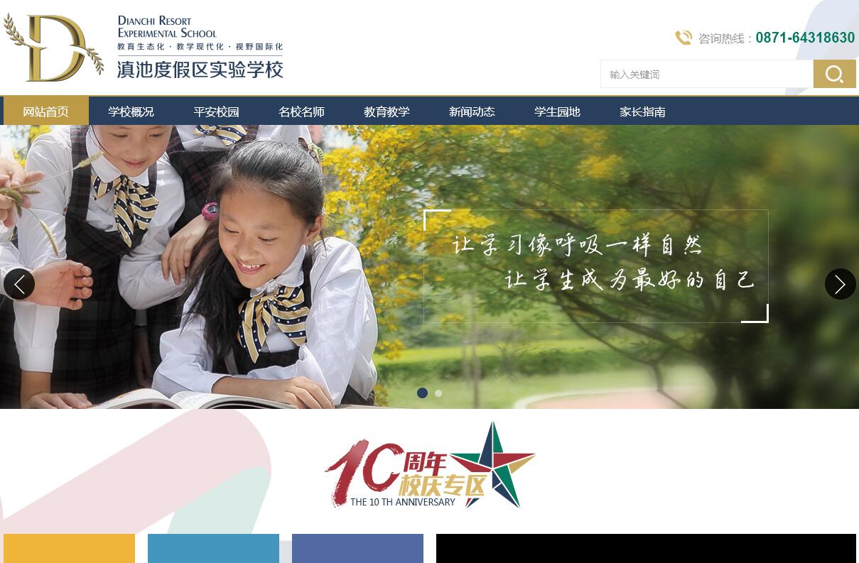 美麗滇池之濱,翠綠西山腳下,有別樣的一所學(xué)校:它攜手現(xiàn)代化、引領(lǐng)生態(tài)化、追逐國(guó)際化,果毅力行、慧心別具、吐故納新,在課堂上培育心靈,在文化中注入風(fēng)骨,在教育中磨礪生活的品質(zhì),在守望中傳遞對(duì)生命的景仰,這就是昆明市滇池度假區(qū)實(shí)驗(yàn)學(xué)校。學(xué)校于2007年9月8日落成開(kāi)學(xué),是由昆明市教育局批準(zhǔn)成立的九年一貫制公辦學(xué)校,目前共有2個(gè)校區(qū),小學(xué)53個(gè)班,初中27個(gè)班,國(guó)際高中4個(gè)班,共有3200多名學(xué)生,263名教職工。在優(yōu)秀的教師團(tuán)隊(duì)中,有國(guó)家級(jí)名校長(zhǎng)1人、特級(jí)教師2人、云嶺名師1人、春城教學(xué)名師2人、昆明市名班主任6名,各級(jí)學(xué)科帶頭人、骨干教師92人,學(xué)校擁有1個(gè)國(guó)家級(jí)名校長(zhǎng)工作室,2個(gè)省級(jí)名師工作室,1個(gè)昆明市勞模工作室,4個(gè)區(qū)級(jí)名師工作室。學(xué)校建成十年來(lái),一直引領(lǐng)師生過(guò)一種幸福完整的教育生活!先后榮獲國(guó)際生態(tài)學(xué)校、國(guó)家級(jí)環(huán)境友好型學(xué)校、全國(guó)內(nèi)涵式發(fā)展學(xué)校、全國(guó)校園安全工作先進(jìn)單位、云南省文明學(xué)校、云南省綠色學(xué)校、云南省首批現(xiàn)代教育示范學(xué)校、昆明市文明學(xué)校等。十年來(lái),學(xué)校課程體系建設(shè)不斷升級(jí)、完善,教育教學(xué)質(zhì)量穩(wěn)步提升,中考質(zhì)量不斷提高,作為度假區(qū)海埂片區(qū)唯一的一所公辦學(xué)校,以兜底的生源入口,經(jīng)過(guò)不斷努力,每年都讓將近50%的學(xué)生考入昆明市一級(jí)高完中,優(yōu)美的校園環(huán)境、和諧生態(tài)文化、多元的課程體系、敬業(yè)的師生團(tuán)隊(duì)、友愛(ài)的家長(zhǎng)朋友,構(gòu)成了實(shí)驗(yàn)學(xué)校這幅美麗的教育畫(huà)卷,學(xué)校、師生、家長(zhǎng)、社會(huì)各方彼此關(guān)愛(ài)、相互鼓勵(lì),共同建設(shè)昆明市領(lǐng)跑、云南省一流、國(guó)內(nèi)外知名的幸福生態(tài)文明校園!學(xué)校老校區(qū)(滇池衛(wèi)城)占地70余畝(46670平方米),建筑面積23000平方米,綠地面積20750平方米,綠化覆蓋率達(dá)59.3%,植種花木20000多株,盆栽花1700多盆。新校區(qū)(西南海)占地39.93畝,建筑面積8943.91平方米,綠地面積7463.20平方米,綠化覆蓋率40%。校園環(huán)境優(yōu)美、設(shè)施齊備。全校教師與學(xué)生在這個(gè)美麗和諧的校園里享受著優(yōu)美的花園式環(huán)境,享受著和諧的幸福式教育。學(xué)校配備了現(xiàn)代教學(xué)設(shè)施及現(xiàn)代師資隊(duì)伍?,F(xiàn)已完成了校園電視臺(tái)、電子閱覽室等現(xiàn)代信息化教學(xué)系統(tǒng)平臺(tái)建設(shè),同時(shí)建成了學(xué)校網(wǎng)站、校方微博、資源共享平臺(tái)、“度教育”公共微信號(hào)等多元化的數(shù)字化運(yùn)用平臺(tái),全面彰顯現(xiàn)代教育、現(xiàn)代學(xué)校、現(xiàn)代管理。學(xué)校率先提出了生態(tài)辦學(xué)目標(biāo):“讓學(xué)習(xí)像呼吸一樣自然,讓學(xué)生成為最好的自己”。學(xué)校把三生及雅行教育的種子播撒在校園每一個(gè)角落,以幸福教育溫暖每個(gè)孩子的成長(zhǎng)之路,溫暖每一個(gè)家庭的筑夢(mèng)之路。以國(guó)際化的視野,營(yíng)造國(guó)際化的學(xué)習(xí)氛圍。雙語(yǔ)課堂的成功踐行,實(shí)現(xiàn)了師生共贏(yíng)。加大師生對(duì)國(guó)際教育理念、文化、課程的學(xué)習(xí)和滲透,用國(guó)際化的理念辦現(xiàn)代化、生態(tài)化的學(xué)校。讓學(xué)生過(guò)幸福完整的學(xué)校生活,讓教師把教育作為幸福來(lái)享受。美麗花園、生態(tài)課堂、現(xiàn)代設(shè)施,雅行教育、三生實(shí)踐,國(guó)際交流、豐富文化,這些都源于這所心靈的花園——昆明市滇池度假區(qū)實(shí)驗(yàn)學(xué)校。2007年落成開(kāi)學(xué)以來(lái),學(xué)校、師生、家長(zhǎng)、社會(huì)各方面彼此關(guān)愛(ài)、相互鼓勵(lì),一起行走在昆明市領(lǐng)跑、云南省一流、國(guó)內(nèi)外知名的幸福學(xué)校、美好未來(lái)的發(fā)展道路上。