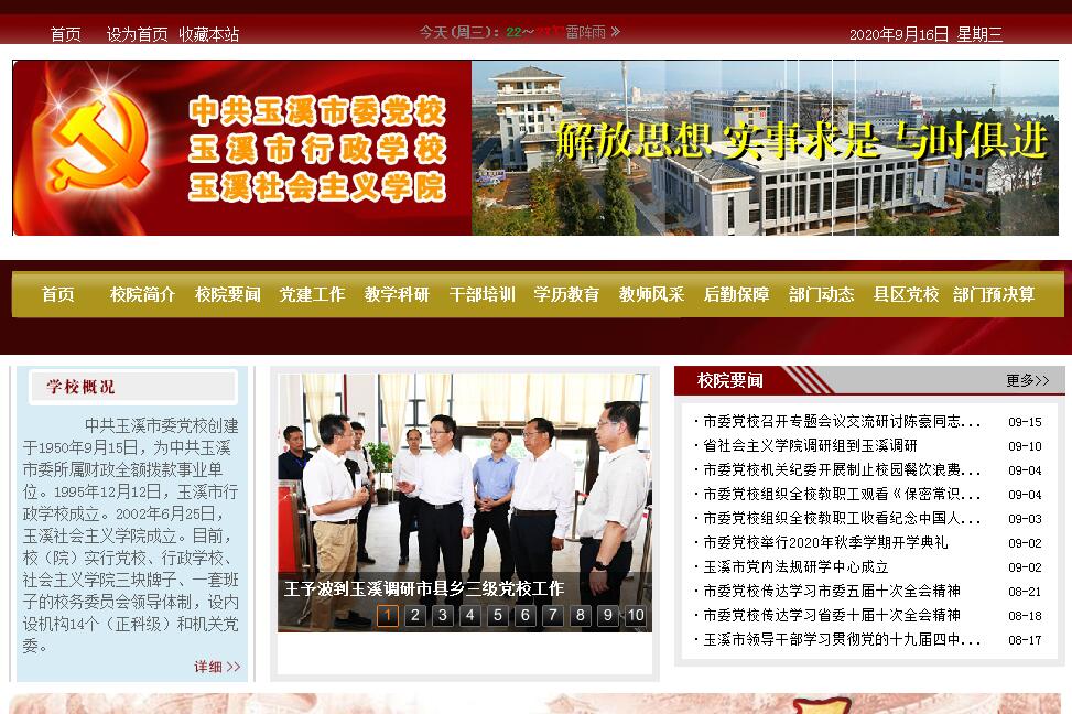 中共玉溪市委黨校創(chuàng)建于1950年9月15日,為中共玉溪市委所屬財政全額撥款事業(yè)單位。1995年12月12日,玉溪市行政學校成立。2002年6月25日,玉溪社會主義學院成立。目前,校(院)實行黨校、行政學校、社會主義學院三塊牌子、一套班子。校(院)位于玉溪市紅塔區(qū)春和街道,與九龍池風景名勝區(qū)、飛井海水庫水源保護地相鄰,總占地面積155.83畝,校舍總建筑面積65584㎡,是一座基礎(chǔ)設(shè)施配套齊全,功能布局均勻協(xié)調(diào)的現(xiàn)代化干部教育培訓基地。校園分為教學區(qū)、生活區(qū)、運動區(qū)、名木古樹區(qū)、文化暢想?yún)^(qū)五大功能區(qū),建有現(xiàn)代化的綜合樓、報告廳、學員樓、餐廳、專家公寓、文體館、半地下架空停車庫等設(shè)施,能同時容納1000人學習、就餐、住宿。園內(nèi)古樹蒼郁、山水相映、景色宜人,是云南省園林單位和玉溪市五星級園林單位。校內(nèi)建有玉溪市反腐倡廉警示教育基地,是中央黨校黨建教學科研玉溪聯(lián)系點和玉溪市領(lǐng)導干部法制教育培訓基地、玉溪市軍轉(zhuǎn)干部培訓基地、玉溪市工會活動基地、玉溪市市直單位職工活動中心、玉溪市社科普及宣傳示范基地,被評為云南省文明單位、玉溪市食品流通監(jiān)管系統(tǒng)試點單位、玉溪市餐飲服務食品安全A級單位和校園改擴建優(yōu)質(zhì)工程一等獎。