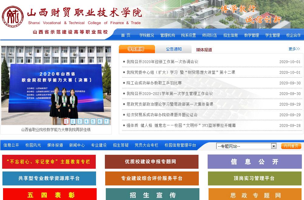 山西財(cái)貿(mào)職業(yè)技術(shù)學(xué)院是經(jīng)教育部、山西省人民政府批準(zhǔn)建立的、隸屬于山西省教育廳的全日制??茖哟蔚墓k普通高等學(xué)校。始建于1978年8月,前身為山西省財(cái)貿(mào)學(xué)校。1993年10月被評(píng)為省部級(jí)重點(diǎn)中專,1994年11月被評(píng)為國內(nèi)貿(mào)易部系統(tǒng)重點(diǎn)中專,2000年5月被評(píng)為國家級(jí)重點(diǎn)中專。2002年4月升格為山西財(cái)貿(mào)職業(yè)技術(shù)學(xué)院,是“山西省示范性高等職業(yè)院?!?。學(xué)院位于太原市民航南路26號(hào),占地面積10萬余平方米,校舍面積9萬余平方米,擁有教學(xué)樓、學(xué)生公寓、餐廳、禮堂、標(biāo)準(zhǔn)運(yùn)動(dòng)場,設(shè)有11個(gè)電子閱覽室,建有58個(gè)先進(jìn)的、并與專業(yè)配套的現(xiàn)代化實(shí)驗(yàn)實(shí)訓(xùn)室,教學(xué)活動(dòng)全部采用多媒體教學(xué)手段。圖書館現(xiàn)有藏書26.2萬余冊(cè),電子圖書23.6萬余冊(cè),電子期刊6.7萬冊(cè),學(xué)位論文25萬冊(cè),音視頻200小時(shí)。配備電腦1920臺(tái),多媒體設(shè)備142套。校園網(wǎng)絡(luò)構(gòu)架合理規(guī)范,辦公、教學(xué)、實(shí)驗(yàn)實(shí)訓(xùn)區(qū)域全網(wǎng)絡(luò)覆蓋。在校生規(guī)模5330余人?,F(xiàn)有在編教師250人,其中高教授3人、副教授70人、碩士研究生以上160人。設(shè)有會(huì)計(jì)系、經(jīng)濟(jì)貿(mào)易系、物聯(lián)網(wǎng)技術(shù)系、文化旅游系、工程藝術(shù)設(shè)計(jì)系、公共課基礎(chǔ)教學(xué)部、思想政治理論教學(xué)部和校企合作培訓(xùn)部等8個(gè)教學(xué)單元,共17個(gè)專業(yè)。其中有:會(huì)計(jì)、制冷與空調(diào)技術(shù)2個(gè)中央財(cái)政支持重點(diǎn)建設(shè)專業(yè),市場營銷1個(gè)省級(jí)教學(xué)改革試點(diǎn)專業(yè),會(huì)計(jì)、連鎖經(jīng)營管理2個(gè)省級(jí)特色專業(yè),會(huì)計(jì)、市場營銷、電子商務(wù)、物流管理4個(gè)山西省高職院校品牌專業(yè),會(huì)計(jì)、物流管理、廣告設(shè)計(jì)與制作、旅游管理、制冷與空調(diào)技術(shù)5個(gè)省級(jí)示范校重點(diǎn)建設(shè)專業(yè),投資與理財(cái)、計(jì)算機(jī)網(wǎng)絡(luò)技術(shù)2個(gè)省級(jí)重點(diǎn)建設(shè)專業(yè),環(huán)境與藝術(shù)設(shè)計(jì)1個(gè)職業(yè)教育高水平重點(diǎn)專業(yè);1個(gè)中央財(cái)政支持的物流實(shí)訓(xùn)基地,1個(gè)省財(cái)政支持的制冷實(shí)訓(xùn)基地,2個(gè)省級(jí)示范實(shí)訓(xùn)基地,2個(gè)省級(jí)重點(diǎn)建設(shè)實(shí)訓(xùn)基地,1個(gè)省級(jí)高水平實(shí)訓(xùn)基地。擁有“五一”勞動(dòng)獎(jiǎng)?wù)芦@得者、山西省“雙師型”優(yōu)秀教師等一批優(yōu)秀教師。歷屆學(xué)生在全國、全省大學(xué)生文化與職業(yè)技能大賽中名列前茅,成績斐然。學(xué)院不斷探索與創(chuàng)新教育教學(xué)方法和育人模式,教育成果斐然,贏得了良好的社會(huì)聲譽(yù),先后榮獲“省級(jí)文明單位”、“山西省示范性高等職業(yè)院?!?、“山西省德育示范學(xué)校”、“山西省模范單位”、“山西省民主管理模范學(xué)?!?、“山西省大學(xué)生思想政治教育先進(jìn)集體”、“山西省職業(yè)教育先進(jìn)單位”、“山西省創(chuàng)建平安校園先進(jìn)單位”、“全省高?!?xiàng)治理’工作先進(jìn)集體”、“高校檔案工作先進(jìn)單位”、“山西省伙食工作先進(jìn)單位”、“山西省計(jì)算機(jī)應(yīng)用能力考核先進(jìn)單位”、“太原市普通話測試先進(jìn)集體”等眾多榮譽(yù)稱號(hào)。近年來,學(xué)院榮獲國家級(jí)、省級(jí)現(xiàn)代學(xué)徒制試點(diǎn)單位;山西省示范性高等職業(yè)院校;山西省職業(yè)教育先進(jìn)單位;山西省優(yōu)質(zhì)校培育建設(shè)單位。學(xué)院秉承“博學(xué)、敦行、誠信、創(chuàng)新”的校訓(xùn),全方位倡導(dǎo)和培育“和諧求真,開拓進(jìn)取”的校風(fēng)、“敬業(yè)愛生,尚德育人”的教風(fēng)和“勵(lì)志篤學(xué),博知精技”的學(xué)風(fēng),力求營造“和諧、誠信、活潑”的校園文化氛圍和“創(chuàng)先爭優(yōu)”的工作風(fēng)氣,努力向特色鮮明、省內(nèi)一流的高職院校邁進(jìn)。