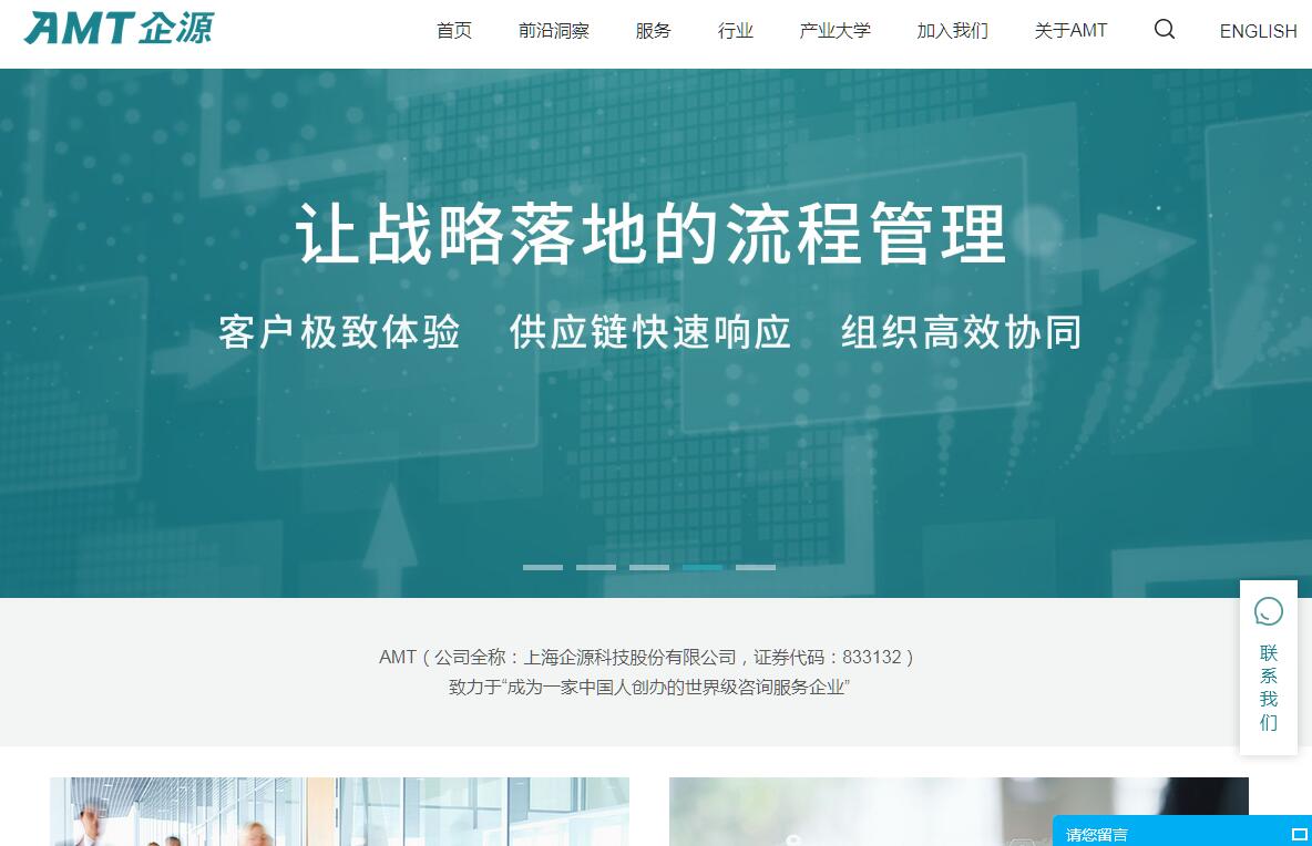 | 網(wǎng)站簡(jiǎn)介: AMT(企源科技)是一家“管理+IT”綜合咨詢服務(wù)機(jī)構(gòu),為客戶提供卓有成效的管理咨詢、十四五規(guī)劃、產(chǎn)業(yè)互聯(lián)網(wǎng)轉(zhuǎn)型、信息化咨詢、流程管理、知識(shí)管理、工程咨詢等,累計(jì)服務(wù)客戶3000多家,70%客戶二次簽約。服務(wù)專線400-881-2881" |
