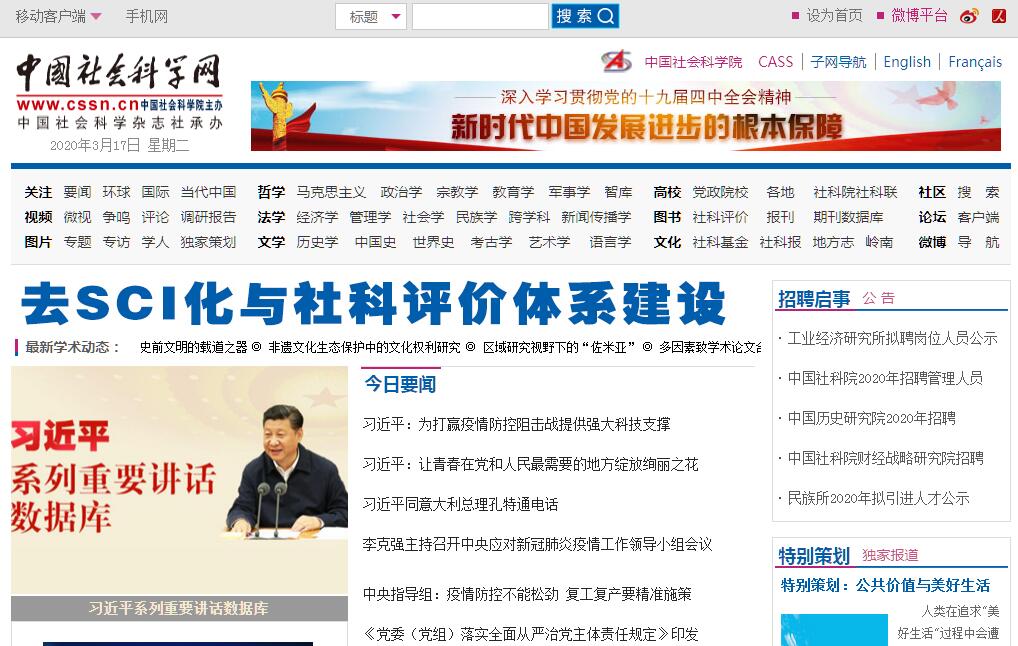 中國社會科學(xué)網(wǎng)是中國社會科學(xué)院主辦、中國社會科學(xué)雜志社承辦的高水平的馬克思主義理論宣傳網(wǎng)、國家級社會科學(xué)學(xué)術(shù)研究網(wǎng)、特大型國內(nèi)外綜合信息網(wǎng),以打造全球最大的學(xué)術(shù)門戶網(wǎng)站為發(fā)展方向,努力建設(shè)成為中國哲學(xué)社會科學(xué)優(yōu)秀成果的高端發(fā)布平臺,全球?qū)W術(shù)資訊的權(quán)威集散地,中國學(xué)術(shù)走向世界的重要橋梁。中國社會科學(xué)網(wǎng)牢固樹立學(xué)術(shù)立網(wǎng)的根本原則,堅持以馬克思主義為指導(dǎo),集學(xué)術(shù)思想性、理論權(quán)威性、資料知識性和公共服務(wù)性于一體,及時發(fā)布全球重大學(xué)術(shù)資訊,追蹤和反映哲學(xué)社會科學(xué)學(xué)術(shù)前沿、學(xué)科趨勢和最新成果。中國社會科學(xué)網(wǎng)于2011年1月1日上線。2014年1月1日,中國社會科學(xué)網(wǎng)新版全新亮相。新版中國社會科學(xué)網(wǎng)堅持學(xué)術(shù)本位,遵循頻道化和專題化的建網(wǎng)路徑,設(shè)置資訊、學(xué)科、綜合和互動四大版塊,開設(shè)54個頻道、1300余個欄目,開辦論壇、博客、微博,開通安卓和iPad等移動客戶端,吸引學(xué)者開設(shè)自媒體平臺,全面呈現(xiàn)學(xué)術(shù)互動功能。中國社會科學(xué)網(wǎng)將和廣大網(wǎng)民一起,共同打造哲學(xué)社會科學(xué)工作者和愛好者的精神家園。中國社會科學(xué)網(wǎng)以馬克思主義為指導(dǎo),堅持正確的政治方向,遵循正確的學(xué)術(shù)導(dǎo)向,彰顯鮮明的學(xué)術(shù)特色,探索新媒體發(fā)展規(guī)律,不斷加強內(nèi)容質(zhì)量,強化網(wǎng)絡(luò)輿論陣地建設(shè)。中國社會科學(xué)網(wǎng)依托中國社會科學(xué)院深厚的學(xué)術(shù)積淀,汲取中國社會科學(xué)雜志社學(xué)術(shù)報刊建設(shè)的優(yōu)良傳統(tǒng),以全球化的學(xué)術(shù)視野,立足中國哲學(xué)社會科學(xué)界,創(chuàng)建高水平的馬克思主義理論宣傳網(wǎng)、國家級社會科學(xué)學(xué)術(shù)研究網(wǎng)、特大型國內(nèi)外綜合信息網(wǎng),彰顯中國學(xué)術(shù)的精神與風(fēng)采。中國社會科學(xué)網(wǎng)以“中國哲學(xué)社會科學(xué)優(yōu)秀成果的高端發(fā)布平臺、全球?qū)W術(shù)資訊的權(quán)威集散地、中國學(xué)術(shù)走向世界的重要橋梁”為發(fā)展定位,致力于打造全球最大的學(xué)術(shù)門戶網(wǎng)站。