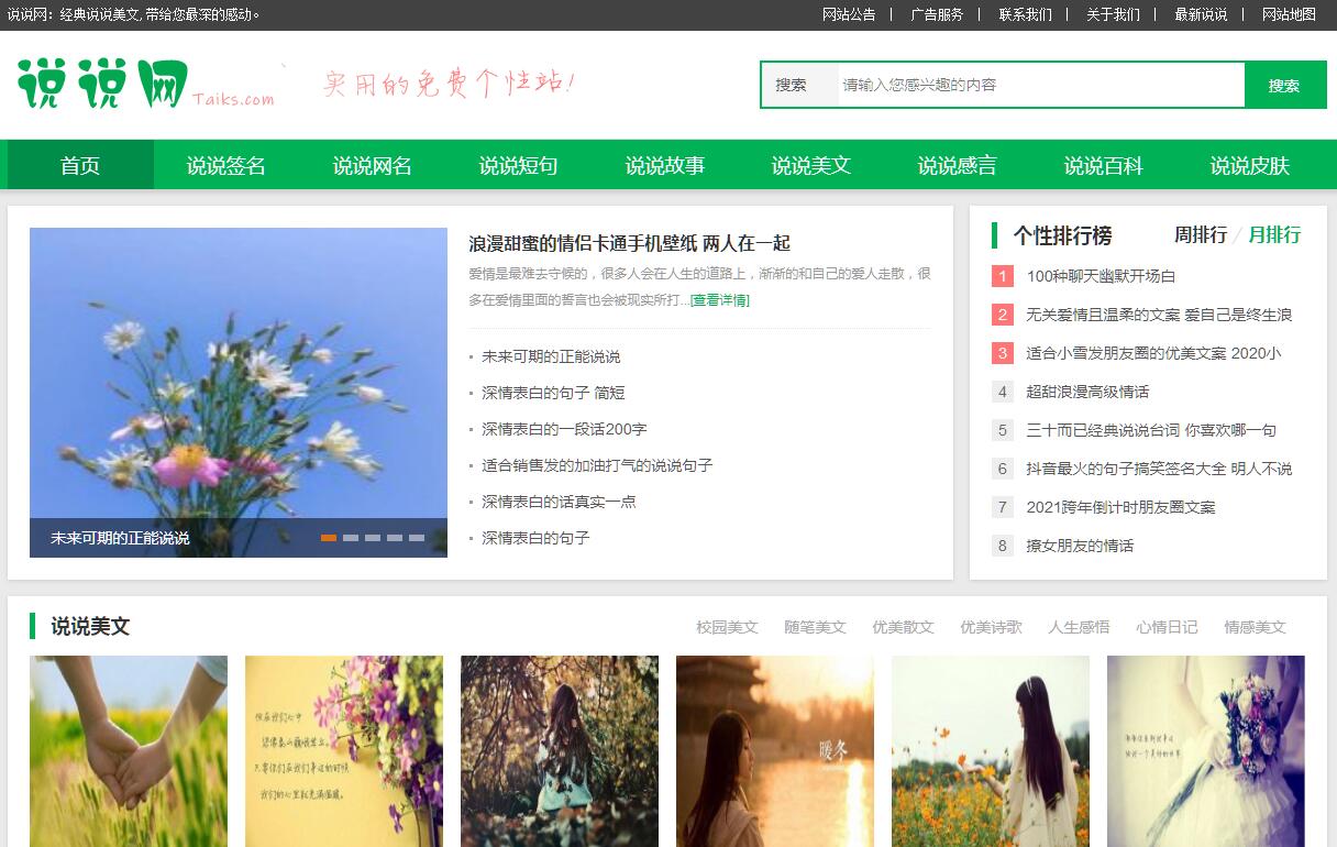 | 網(wǎng)站簡(jiǎn)介: 說(shuō)說(shuō)網(wǎng)(www.taiks.com)提供各種人生感悟的說(shuō)說(shuō)美文句子。有說(shuō)說(shuō)簽名、說(shuō)說(shuō)網(wǎng)名、說(shuō)說(shuō)短句、說(shuō)說(shuō)美文、說(shuō)說(shuō)故事、傷感說(shuō)說(shuō)及愛(ài)情說(shuō)說(shuō)等,帶給您最深的感動(dòng)。 |