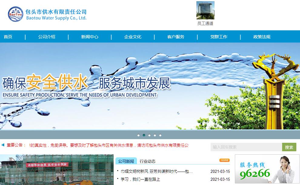 | 網(wǎng)站簡介: 包頭市供水有限責任公司(以下簡稱:包頭水司)始建于1956年,隸屬于包頭市水務(wù)(集團)有限公司,擔負著包頭市220萬城市居民及8萬非居民用戶的供水重任。 |