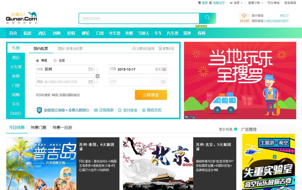 去哪兒網(wǎng)(Qunar.com)是中國領(lǐng)先的無線和在線旅游平臺(tái),其網(wǎng)站上線于2005年5月,公司總部位于北京。去哪兒網(wǎng)致力于建立一個(gè)為整個(gè)旅游業(yè)價(jià)值鏈服務(wù)的生態(tài)系統(tǒng),并通過科技來改變?nèi)藗兊穆眯蟹绞?。去哪兒網(wǎng)通過其自有技術(shù)平臺(tái)有效匹配旅游業(yè)的供需,滿足旅游服務(wù)供應(yīng)商和中國旅行者的需求。對旅游服務(wù)供應(yīng)商而言,去哪兒網(wǎng)通過移動(dòng)客戶端及在線平臺(tái)為其提供技術(shù)基礎(chǔ)設(shè)施;對旅行者而言,去哪兒網(wǎng)通過網(wǎng)站及移動(dòng)客戶端的全平臺(tái)覆蓋,隨時(shí)隨地為其提供國內(nèi)外機(jī)票、酒店、度假、旅游團(tuán)購、及旅行信息的深度搜索,幫助旅行者找到性價(jià)比較高的產(chǎn)品、較優(yōu)質(zhì)的信息和便捷的預(yù)訂方式,聰明地安排旅行。根據(jù)2014年9月艾瑞監(jiān)測數(shù)據(jù),在旅行類網(wǎng)站月度獨(dú)立訪問量統(tǒng)計(jì)中,去哪兒網(wǎng)以4474萬人名列前茅。截至2015年3月31日,去哪兒網(wǎng)可實(shí)時(shí)搜索約9,000家旅游代理商網(wǎng)站,搜索范圍覆蓋全球范圍內(nèi)超過28萬條國內(nèi)及國際航線、約103萬家酒店、85萬余條度假線路、近萬個(gè)旅游景點(diǎn),并且每日提供超過20萬種旅游團(tuán)購產(chǎn)品。去哪兒網(wǎng)移動(dòng)客戶端“去哪兒旅行”是中國旅行類較受歡迎的移動(dòng)應(yīng)用,截至第一季度末擁有超過8億的激活下載量。根據(jù)中國互聯(lián)網(wǎng)絡(luò)信息中心(CNNIC)發(fā)布的《2012年中國網(wǎng)民在線旅行預(yù)訂行為調(diào)查報(bào)告》,去哪兒旅行是手機(jī)旅行信息查詢用戶安裝和使用較多的移動(dòng)客戶端。去哪兒Qunar.com提供機(jī)票,飛機(jī)票,特價(jià)機(jī)票,打折機(jī)票的查詢預(yù)訂;99元春秋航空特惠折扣機(jī)票,百元南航、海航驚喜特價(jià)機(jī)票任您挑選,國航、深航1折特價(jià)機(jī)票和折扣機(jī)票一網(wǎng)打盡,更多打折機(jī)票盡在Qunar.com。實(shí)時(shí)提供上百家旅游預(yù)訂網(wǎng)站機(jī)票報(bào)價(jià)和航空公司直銷機(jī)票價(jià)格,為您找到最實(shí)惠的飛機(jī)票信息,是你查詢特價(jià)機(jī)票和機(jī)票預(yù)訂的最佳途徑。