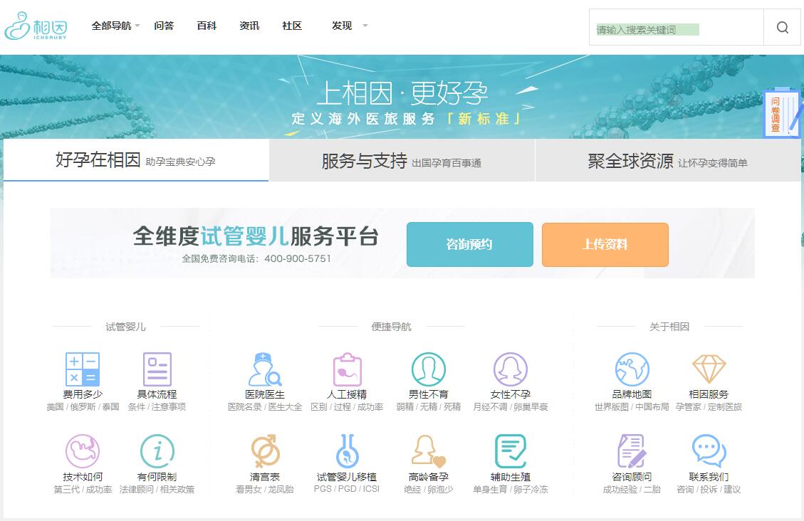 | 網(wǎng)站簡介: 相因,4000萬不孕不育家庭的信息中心。聚合全球試管嬰兒醫(yī)院、醫(yī)生資訊,以方便客戶獲取最新試管嬰兒流程、費(fèi)用、成功率等,同時(shí)提供美國、泰國、馬來西亞、俄羅斯、柬埔寨等海外試管嬰兒醫(yī)旅服務(wù)。 |