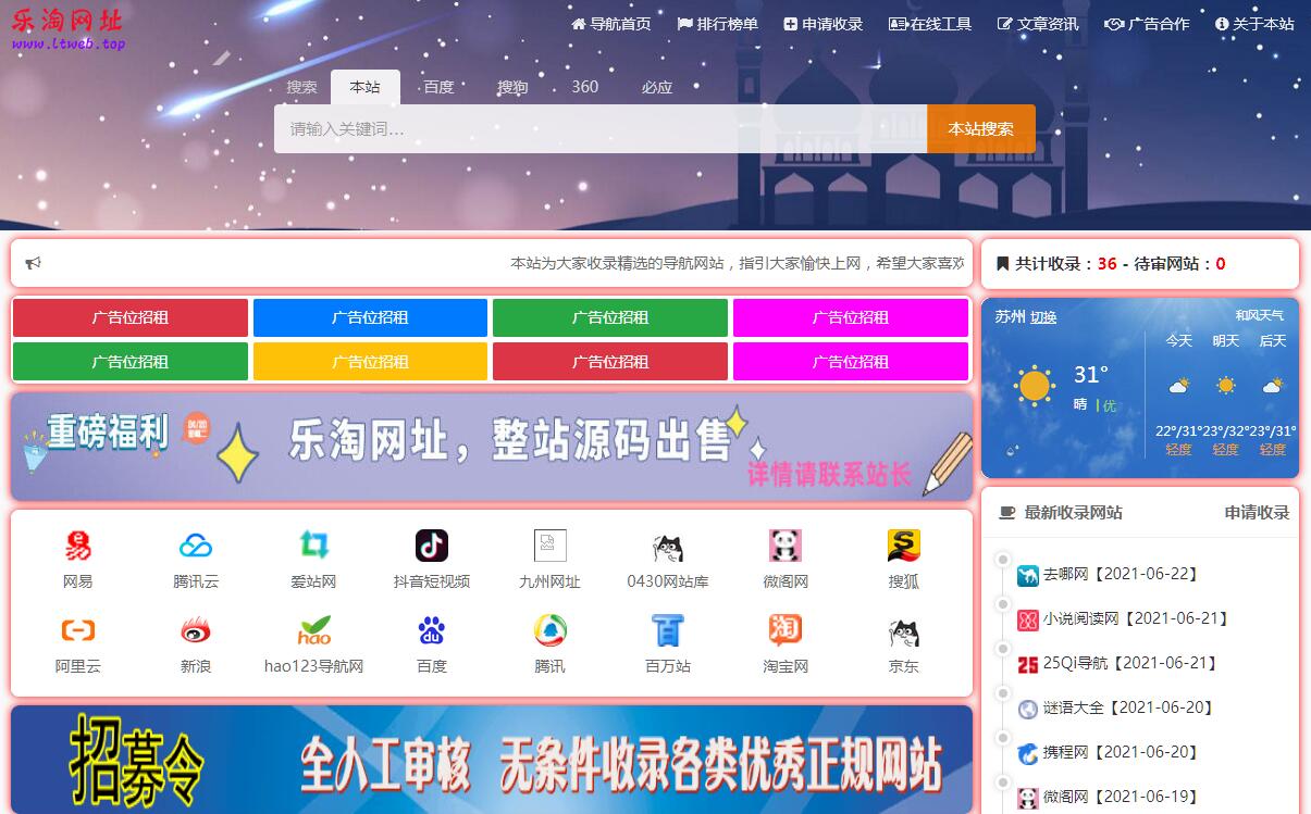 | 網(wǎng)站簡(jiǎn)介: 樂淘網(wǎng)址為您提供網(wǎng)站分類目錄索引及網(wǎng)址大全庫的建立,樂淘網(wǎng)址旨在為用戶提供高效便捷的網(wǎng)址存儲(chǔ)和查詢服務(wù),同時(shí)提供優(yōu)秀名站導(dǎo)航。 |