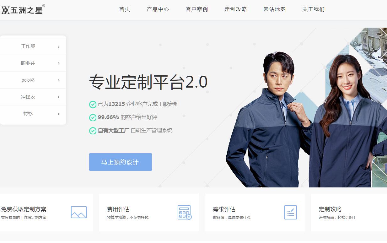 | 網(wǎng)站簡介: 「五洲之星」萬家品牌企業(yè)的選擇,有質(zhì)有量的工服定制廠家!為企業(yè),國家單位提供工服定制,職業(yè)裝定制,沖鋒衣定制等一體化服裝定制服務(wù),可信賴的專業(yè)服裝定制平臺! |