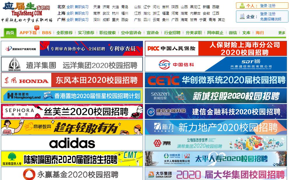 | 網(wǎng)站簡(jiǎn)介: 應(yīng)屆生求職網(wǎng)YingJieSheng.COM是中國(guó)領(lǐng)先的專門(mén)面向大學(xué)生及在校生的求職招聘網(wǎng)站。應(yīng)屆生求職網(wǎng)YingJieSheng.COM向大學(xué)生及在校生提供新、全、準(zhǔn)確的校園全職招聘、實(shí)習(xí)招聘、兼職招聘、企業(yè)宣講會(huì)、招聘會(huì)、企業(yè)招聘截止日期等招聘信息,并同時(shí)提供職業(yè)測(cè)評(píng)、應(yīng)聘指導(dǎo)等求職就業(yè)資訊及輔導(dǎo)。應(yīng)屆生求職網(wǎng)YingJieSheng.com始終以大學(xué)生需求為導(dǎo)向,注重給大學(xué)生提供滿意的網(wǎng)上求職服務(wù)體驗(yàn),用權(quán)威、高效的專業(yè)服務(wù)做好大學(xué)生與社會(huì)的對(duì)接。應(yīng)屆生求職網(wǎng)yingjiesheng.com(中國(guó)領(lǐng)先的大學(xué)生求職網(wǎng)站)提供最新、最全、最準(zhǔn)確的應(yīng)屆大學(xué)畢業(yè)生校園招聘信息,兼職實(shí)習(xí)信息以及校園宣講會(huì)和校園招聘會(huì)信息,覆蓋上海北京廣州深圳武漢南京天津成都等地區(qū)。 |