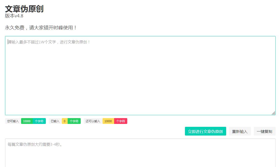 | 網(wǎng)站簡介: 本站為大家提供免費(fèi)的文章偽原創(chuàng)工具,訪問網(wǎng)頁直接就可在線生成偽原創(chuàng)文章,不限制次數(shù),1W字以內(nèi),是當(dāng)前行業(yè)內(nèi)比較好用的ai偽原創(chuàng)工具。 |