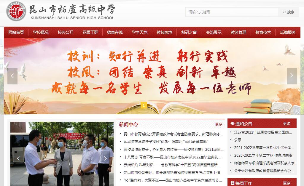 | 網(wǎng)站簡介: 昆山市柏廬高級中學是一所昆山市教育局直屬的公辦普通高中。學校北依玉峰山,南臨西塘河,地處昆山市中心黃金地段,交通便捷。校園古杉成林,文化底蘊深厚,是理想的讀書圣地。校園占地面積83876平方米,建筑面積62512平方米,教學、運動、生活三區(qū)相對獨立又渾然一體。教學樓、實驗樓、科技樓、圖書館、體育館、學生公寓等基礎設施齊全。現(xiàn)代教育技術系統(tǒng)、數(shù)字廣播系統(tǒng)、安監(jiān)系統(tǒng)等覆蓋校園,實現(xiàn)了“環(huán)境園林化、設備現(xiàn)代化、食堂標準化、宿舍公寓化”。學?,F(xiàn)有教學班42個,在校學生2180名。2020年5月順利晉評江蘇省三星級普通高中。2022年將創(chuàng)建江蘇省四星級普通高中。 |