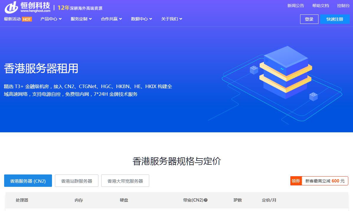 | 網站簡介: 恒創(chuàng)科技是國內知名的香港/海外數據中心基礎服務商,基于優(yōu)|質香港數據中心,提供香港CN2服務器、香港多IP站群服務器、香港服務器租用服務,數據中心全球BGP多線接入,且提供電信CN2線路直連,高速穩(wěn)定。 |