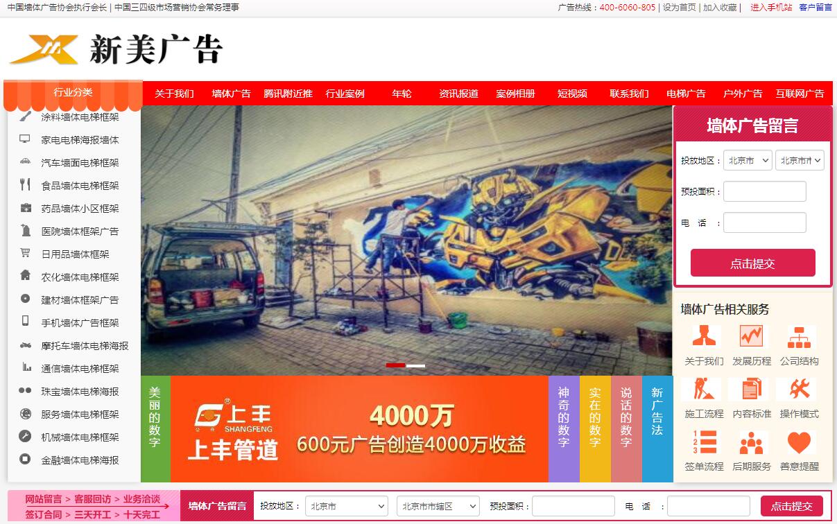 | 網(wǎng)站簡(jiǎn)介: 湖北新美廣告有限責(zé)任公司-墻體廣告公司誠(chéng)信優(yōu)勢(shì)品牌,提供全國(guó)優(yōu)質(zhì)的戶外墻體廣告刷墻廣告,電梯框架,道閘,互聯(lián)網(wǎng)廣告,彩繪墻體價(jià)格,墻體噴繪制作發(fā)布。 |