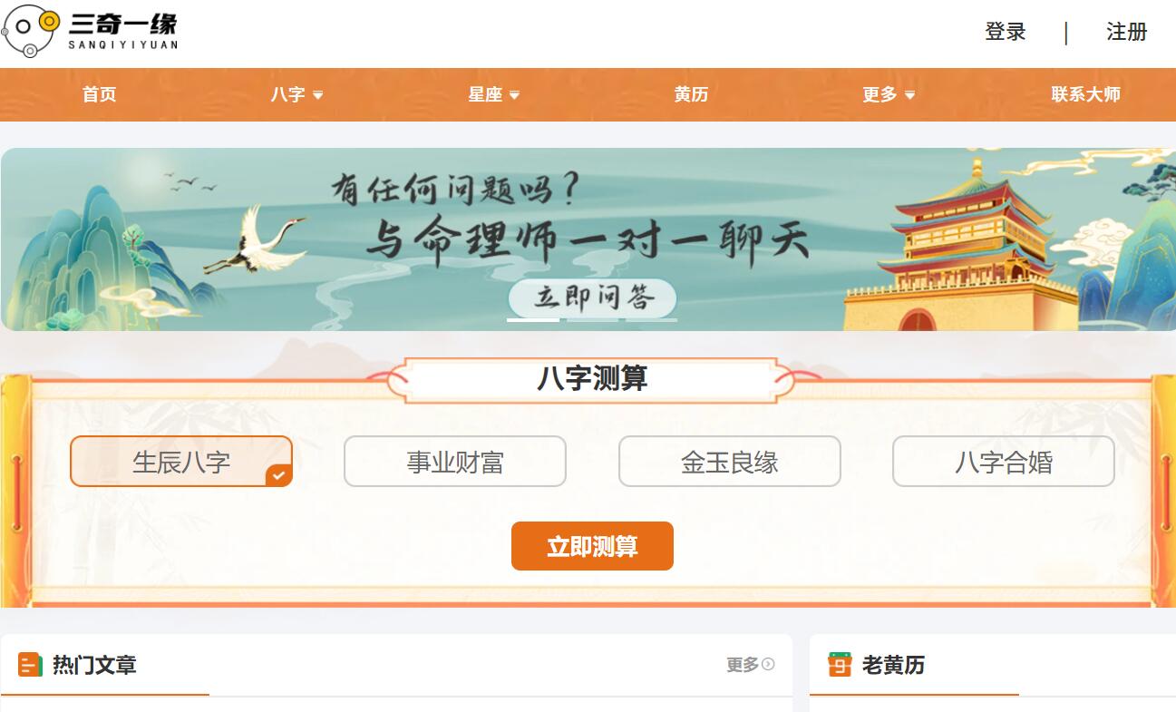 | 網(wǎng)站簡(jiǎn)介: 三奇一緣是專業(yè)的婚姻測(cè)算服務(wù)平臺(tái),數(shù)十位資深婚姻測(cè)算大師,一對(duì)一測(cè)算。為您提供排盤、免費(fèi)算命、婚姻、姻緣、財(cái)富、運(yùn)勢(shì)、吉兇、八字詳批等服務(wù)。 |