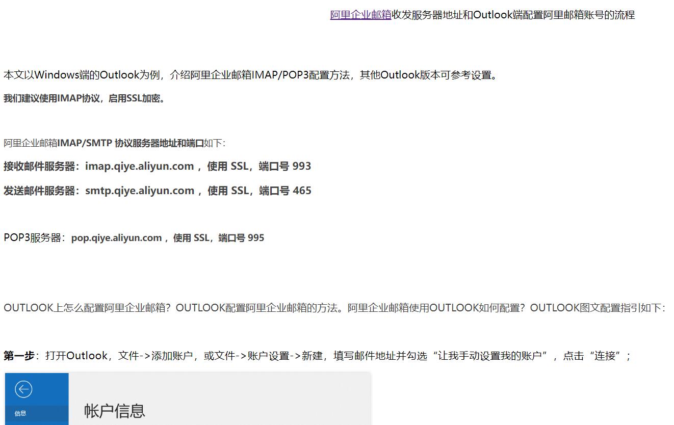 | 網(wǎng)站簡介: 阿里郵箱OUTLOOK設置( exmail.biz/outlook )此頁面本文以Windows端的Outlook為例,介紹阿里企業(yè)郵箱IMAP/POP3配置方法,其他Outlook版本可參考設置。OUTLOOK上怎么配置阿里企業(yè)郵箱?OUTLOOK配置阿里企業(yè)郵箱的方法。阿里企業(yè)郵箱使用OUTLOOK如何配置?以上問題在這個頁面有圖文教程。阿里企業(yè)郵箱( exmail.biz )是阿里云重要產(chǎn)品之一,專業(yè)提供的云計算技術和平臺,基于龐大的服務器集群構建的企業(yè)郵箱平臺。 桑橋網(wǎng)絡( sangqiao.com )是專業(yè)的企業(yè)郵箱服務商,是阿里企業(yè)郵箱官方授權經(jīng)銷代理商。專業(yè)為你提供阿里企業(yè)郵箱+釘釘部署、設置、開通、注冊、申請、購買、擴容、咨詢、售后技術支持等服務。客戶的滿意,永遠是我們的第一追求。有企業(yè)郵箱需要的朋友們,歡迎垂詢,有優(yōu)惠折扣等著你。 |