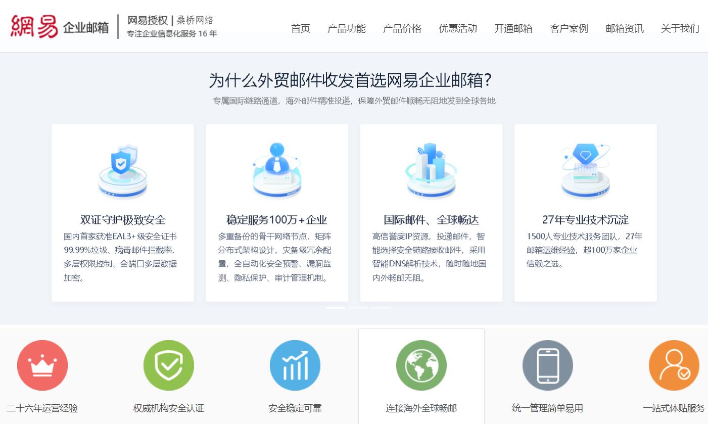 為什么外貿(mào)郵件收發(fā)首選163外貿(mào)企業(yè)郵箱( www.exmail.vip/foreign )?163網(wǎng)易企業(yè)郵箱專屬國際鏈路通道,海外郵件精準(zhǔn)投遞,保障外貿(mào)郵件順暢無阻地發(fā)到全球各地。163網(wǎng)易企業(yè)郵箱授權(quán)服務(wù)商( www.exmail.vip )——杭州桑橋網(wǎng)絡(luò)科技有限公司( www.sangqiao.com )為你辦理升級開通外貿(mào)企業(yè)郵箱、外貿(mào)郵箱、網(wǎng)易外貿(mào)企業(yè)郵箱、網(wǎng)易外貿(mào)郵箱、163外貿(mào)企業(yè)郵箱。。。好吧,其實沒有那么多外貿(mào)企業(yè)郵箱,我們這里就是是幫你開通網(wǎng)易企業(yè)郵箱,用于外貿(mào)(國際貿(mào)易)業(yè)務(wù)往來時的電子郵件收發(fā)。網(wǎng)易外貿(mào)企業(yè)郵箱全球郵件服務(wù)器部署,無限郵箱容量、支持各種超大附件、支持外貿(mào)郵件的全球互通互聯(lián),高速又靠譜。