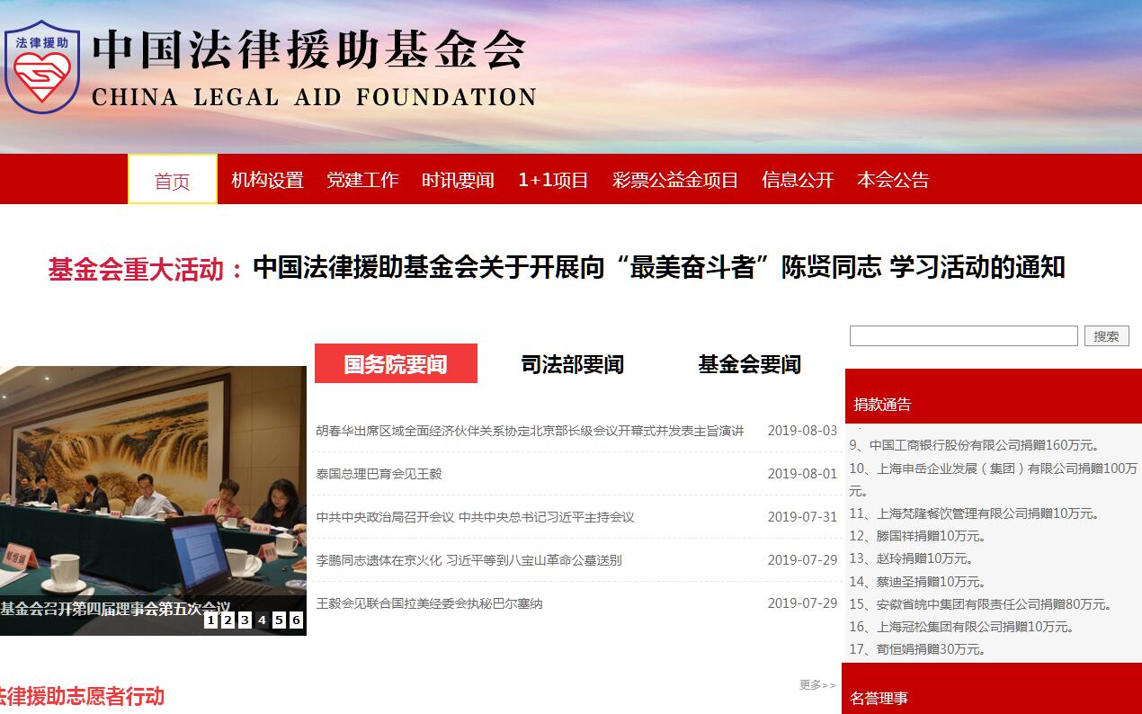 中國法律援助基金會是經(jīng)國務(wù)院批準(zhǔn),于1997年在民政部依法登記成立的公募基金會,是目前我國唯一一家致力于發(fā)展法律援助事業(yè)的全國性公募基金會。中國法律援助基金會經(jīng)歷了第一、第二屆、第三屆理事會,2016年6月成立了第四屆理事會。中國法律援助基金會的宗旨是保障全體公民享受平等的司法保護,維護法律賦予公民的基本權(quán)利。中國法律援助基金會的主要任務(wù)是募集法律援助資金,為實施法律援助提供物質(zhì)支持,促進司法公正,維護社會公平與正義。近年來,在司法部和中國法律援助基金會理事會的領(lǐng)導(dǎo)下,在慈善企業(yè)、愛心人士的關(guān)心和支持下,中國法律援助基金會根據(jù)不同人群和地區(qū)的需要,先后設(shè)立了22個專項基金,分別是中國優(yōu)秀學(xué)子法律援助專項基金、“592”法律援助專項基金、農(nóng)民工法律援助專項基金、中國民間對日索賠法律援助專項基金、殘疾人法律援助專項基金、婦女家庭權(quán)益保障專項基金、老年人法律援助專項基金、未成年人法律援助專項基金、生態(tài)環(huán)保法律援助專項基金、5.12孤殘法律援助專項基金、災(zāi)區(qū)縣級法律援助重建基金、“1+1”中國法律援助志愿者行動專項基金、中央專項彩票公益金法律援助項目、法治陽光基金、維護民營企業(yè)合法權(quán)益專項基金、立德樹人法律援助專項基金、復(fù)員轉(zhuǎn)業(yè)軍人法律援助專項基金、互聯(lián)網(wǎng)法律援助專項基金、法治文化公益基金、礦山能源行業(yè)法律援助專項基金、寰宇法律援助專項基金、醫(yī)藥衛(wèi)生行業(yè)法律援助專項基金。在這些來自社會的專項基金支持下,在尊重捐贈人意愿的前提下,中國法律援助基金會以科學(xué)的管理、誠實的信譽、執(zhí)著追求公平與正義的精神,嚴(yán)格遵守《慈善法》、《基金會管理條例》、《公益事業(yè)捐贈法》等有關(guān)法律、法規(guī)的規(guī)定,按照“費用支出最低化、服務(wù)數(shù)量最大化、服務(wù)質(zhì)量最優(yōu)化”原則,成功組織實施了一系列具有廣泛社會影響的法律援助項目,資助辦理了大量法律援助案件,有效維護了弱勢群體的合法權(quán)益,受到社會各界廣泛贊譽。十多年來,中國法律援助基金會取得了長足發(fā)展和進步,先后被民政部評為“4A級社會組織”和“全國先進社會組織”,獲得“中國十大法制人物”和“中華慈善獎”等榮譽稱號。