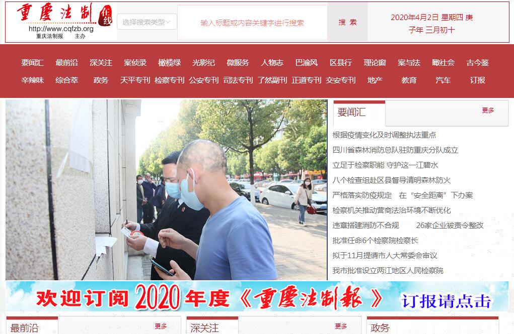 | 網站簡介: 《重慶法制報》自創(chuàng)刊以來,始終堅持正確的輿論導向,緊緊抓住依法治國、依法治市的宣傳主題,關注民主與法制建設,關注國家重大政策、方針以及本市中心工作,關注社會熱點和難點,弘揚法制,服務社會,普及法律知識,揭露違法犯罪,推動兩個文明建設。 |