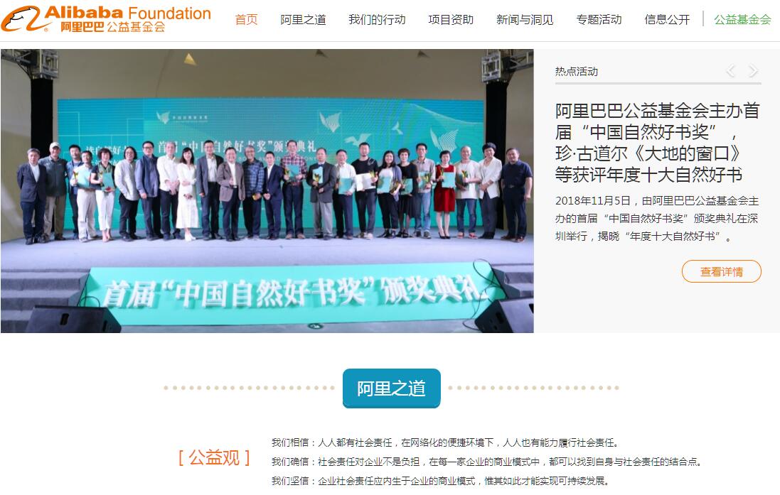 阿里巴巴公益基金會(英文名“Alibaba Foundation”)經(jīng)民政部通過,于2011年12月 22日正式成立,由國家民政部主管的全國性非公募基金會。阿里巴巴公益基金會由阿里巴巴集團旗下4家公司聯(lián)合發(fā)起,原始基金為5000萬元人民幣。阿里巴巴公益基金會將通過集中公益資源、提升公益項目效率和專業(yè)性,促進社會公益事業(yè)發(fā)展,為和諧社會做貢獻。為更好地履行企業(yè)社會責(zé)任,建立長期穩(wěn)定的公益資金投入機制,快速應(yīng)對突發(fā)的自然災(zāi)害和擴大資助的公益范圍,阿里巴巴集團承諾每年會將收入的一定比例捐贈給阿里巴巴公益基金會,此捐款為阿里巴巴公益基金會的主要資金來源。承擔(dān)阿里巴巴應(yīng)有的社會責(zé)任是阿里巴巴公益基金會的使命。阿里巴巴公益基金會的宗旨是:營造公益氛圍,發(fā)展公益事業(yè),促進人與社會、人與自然的可持續(xù)發(fā)展。資助重點包括:水環(huán)境保護,環(huán)境保護宣傳,以及支持環(huán)保類公益組織的發(fā)展。