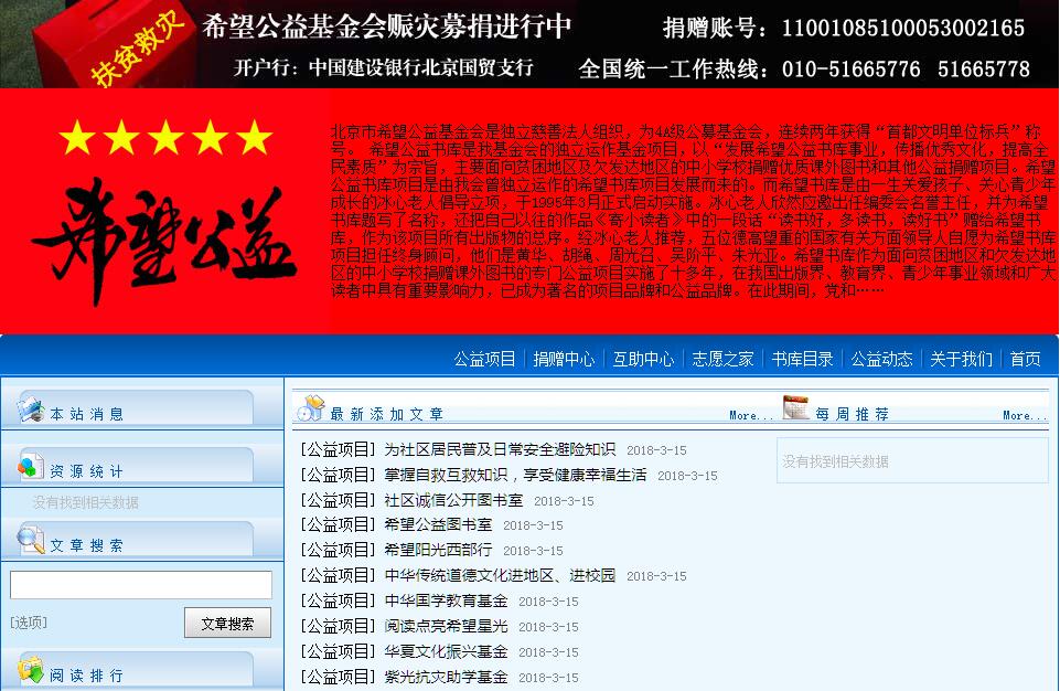 北京市希望公益基金會(huì)是獨(dú)立慈善法人組織,為4A級(jí)公募基金會(huì),連續(xù)多年獲得“科協(xié)系統(tǒng)文明單位”稱號(hào)、“首都文明單位標(biāo)兵”稱號(hào)、“北京市社會(huì)組織示范基地”。我們的公益項(xiàng)目連續(xù)被“中央財(cái)政支持社會(huì)組織參與社會(huì)服務(wù)”項(xiàng)目辦選中,獲得了中央財(cái)政的支持。希望公益書庫是我基金會(huì)的獨(dú)立運(yùn)作基金項(xiàng)目,以“發(fā)展希望公益書庫事業(yè),傳播優(yōu)秀文化,提高全民素質(zhì)”為宗旨,主要面向貧困地區(qū)及欠發(fā)達(dá)地區(qū)的中小學(xué)校捐贈(zèng)優(yōu)質(zhì)課外圖書和其他公益捐贈(zèng)項(xiàng)目。希望公益書庫項(xiàng)目是由我會(huì)曾獨(dú)立運(yùn)作的希望書庫項(xiàng)目發(fā)展而來的。而希望書庫是由一生關(guān)愛孩子、關(guān)心青少年成長的冰心老人倡導(dǎo)立項(xiàng),于1995年3月正式啟動(dòng)實(shí)施。冰心老人欣然應(yīng)邀出任編委會(huì)名譽(yù)主任,并為希望書庫題寫了名稱,還把自己以往的作品《寄小讀者》中的一段話“讀書好,多讀書,讀好書”贈(zèng)給希望書庫,作為該項(xiàng)目所有出版物的總序。經(jīng)冰心老人推薦,五位德高望重的國家有關(guān)方面領(lǐng)導(dǎo)人自愿為希望書庫項(xiàng)目擔(dān)任終身顧問,他們是黃華、胡繩、周光召、吳階平、朱光亞。希望書庫作為面向貧困地區(qū)和欠發(fā)達(dá)地區(qū)的中小學(xué)校捐贈(zèng)課外圖書的專門公益項(xiàng)目實(shí)施了十多年,在我國出版界、教育界、青少年事業(yè)領(lǐng)域和廣大讀者中具有重要影響力,已成為著名的項(xiàng)目品牌和公益品牌。在此期間,黨和國家領(lǐng)導(dǎo)人給予了親切的關(guān)懷,社會(huì)各界愛心人士廣泛支持并積極參與,到2014年底,累計(jì)為貧困地區(qū)和欠發(fā)達(dá)地區(qū)的一萬多所中小學(xué)校捐贈(zèng)了1000多萬冊(cè)書籍,上億名亟需精神食糧的孩子從希望書庫中受益。我基金會(huì)還有:精英圖書館、希望圖書角、醫(yī)療扶貧、小小希望書庫(幼兒園)、希望小學(xué)、希望電教室、捐資助學(xué)等項(xiàng)目,希望公益書庫基金、中國書畫藝術(shù)發(fā)展基金、華夏文化振興基金、中華國學(xué)教育基金、中國校園安全教育基金、紫光抗災(zāi)助學(xué)基金、外來務(wù)工人員和低收入家庭法律援助基金、希望體育發(fā)展基金、東方道德文化基金、春苗扶貧基金、中國當(dāng)代書畫名家基金、中國抗戰(zhàn)文化基金、中國紀(jì)錄片基金、親貝關(guān)愛孕嬰健康基金、朱子文化教育基金、華人臺(tái)球聯(lián)盟基金等多個(gè)項(xiàng)目正在執(zhí)行中。
