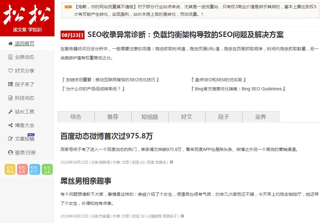| 網站簡介: 松松網(盧松松博客)從2009年創(chuàng)立至今,已經成為國內知名的垂直網站之一。我們一直致力于提供前沿的網絡推廣知識,為草根站長與創(chuàng)業(yè)者提供全面的網絡推廣、網絡營銷、網站優(yōu)化、創(chuàng)業(yè)故事等文章。 |