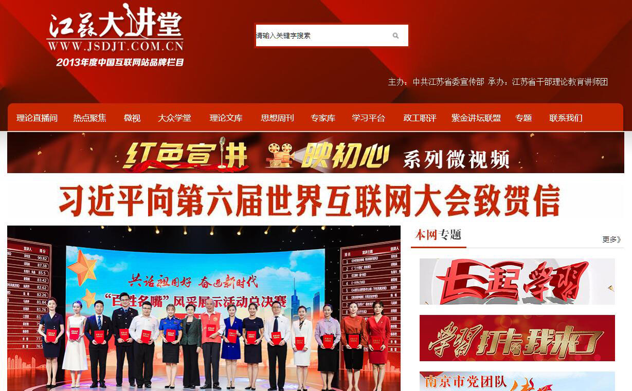 | 網(wǎng)站簡介: 江蘇大講堂由江蘇省委宣傳部主辦,江蘇省干部理論教育講師團承辦的一個干部理論教育學(xué)習(xí)的平臺。打造理論智庫,構(gòu)建學(xué)習(xí)交流平臺,傳播黨的創(chuàng)新理論,指導(dǎo)全省理論學(xué)習(xí),開展形勢政策教育,推動馬克思主義大眾化,弘揚“三創(chuàng)三先”新時期江蘇精神,服務(wù)全省經(jīng)濟社會全面發(fā)展。 |