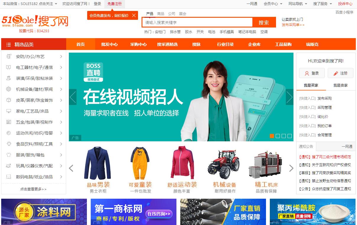 搜了網(wǎng)(51sole.com)專注于為企業(yè)用戶提供B2B市場行情,熱點采購、加工批發(fā),產(chǎn)品信息,黃金商鋪,網(wǎng)上推廣等,是企業(yè)進行電子商務和網(wǎng)上推廣的首選行業(yè)門戶,聰明的老板上搜了網(wǎng)!深圳市搜了網(wǎng)絡科技股份有限公司前身為深圳市搜了信息技術(shù)有限公司,成立于2008 年9月,并于2015年7月完成股份制改革,2015 年11月成功掛牌新三板。公司總部設立于深圳市南山區(qū)南海大道新能源大廈B座11樓,下設銀川分公司。為國家高新技術(shù)企業(yè)。公司從搜索引擎起步,逐步成為國內(nèi)領先的 B2B 電子商務平臺運營商。公司主要產(chǎn)品為“搜了網(wǎng)”、“搜脈”APP 移動客戶端、搜了旗下垂直電商平臺?!八蚜司W(wǎng)”是搜了公司旗下核心平臺,通過發(fā)布產(chǎn)品信息,促成客戶溝通和達成交易,為中小企業(yè)提供免費信息服務、會員增值服務和網(wǎng)絡推廣服務等一站式電子商務運營服務?!八衙}”是“搜了網(wǎng)”向移動互聯(lián)網(wǎng)端的延伸,更是將商業(yè)信息聚合開放,實現(xiàn)資源無縫對接,用戶進行高效溝通,解放傳統(tǒng)的聚集資源及人脈的模式,實現(xiàn)真正的生意人的移動網(wǎng)絡平臺。搜了旗下垂直電商平臺集中了“搜了網(wǎng)”在運營中不斷積累的優(yōu)質(zhì)資源,為有交易需求的企業(yè)用戶提供對接渠道。公司通過獨立域名或者搜了商城子域名為商家提供電子商務整體解決方案,覆蓋了安防、化工、環(huán)保、機械、農(nóng)業(yè)、冶金等多個細分行業(yè),是一個擁有全新的系統(tǒng)架構(gòu)和服務方式的垂直多行業(yè) 細分電商平臺。深圳市搜了網(wǎng)絡科技股份有限公司在不斷堅持產(chǎn)品優(yōu)化和創(chuàng)新的同時,始終堅信人才是公司最寶貴的資源,十分關(guān)注員工的成長和進步。公司通過多樣性和及時性的績效激勵制度,鼓勵價值創(chuàng)造,嘉獎價值創(chuàng)造;并通過營造良好的組織氛圍,建立凝聚力強的企業(yè)文化,引導大家為共同的價值觀和組織目標而努力奮斗。今天,深圳市搜了網(wǎng)絡科技股份有限公司將繼續(xù)強化“搜索技術(shù)、即時商機技術(shù)”及加強為中小企業(yè)提供服務的功能為戰(zhàn)略發(fā)展方向,緊緊圍繞、聚焦客戶需求,成就客戶事業(yè)為主軸,進一步加強研發(fā)力量,不斷的為顧客、合作伙伴、員工創(chuàng)造新價值。未來,深圳市搜了網(wǎng)絡科技股份有限公司將全面發(fā)展,依托技術(shù)創(chuàng)新、構(gòu)筑產(chǎn)品優(yōu)勢、樹立品牌 意識,從而使網(wǎng)絡整合營銷更加高效、簡單、快捷。積極爭取將公司打造成為一流的互聯(lián)網(wǎng)企業(yè)。