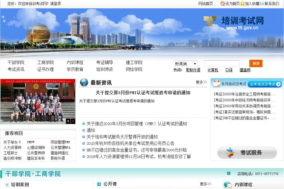 杭州培訓(xùn)考試網(wǎng)(www.ttt.gov.cn)創(chuàng)建于2002年,是一家立足杭州,服務(wù)全國的專業(yè)性門戶網(wǎng)站,旨在為社會各類人員參加培訓(xùn)考試提供全面、及時、權(quán)威的供求信息的同時,為各考試培訓(xùn)機(jī)構(gòu)建立一個快速準(zhǔn)確的信息發(fā)布平臺,為廣大求知者提供一個方便快捷的學(xué)習(xí)途徑。網(wǎng)站提供的主要內(nèi)容:考試信息:提供各類公務(wù)員考試、職稱考試、職業(yè)考試、執(zhí)業(yè)考試等最新動態(tài);培訓(xùn)信息:提供各類緊缺人才培訓(xùn)、高層次人才培訓(xùn)、企業(yè)內(nèi)訓(xùn)、公務(wù)員培訓(xùn)、各類考試配套培訓(xùn)等最新動態(tài);學(xué)歷教育:提供各專業(yè)、多層次如:高升專、專升本、研究生等學(xué)歷教育信息;網(wǎng)上報名:提供網(wǎng)上填報名表、網(wǎng)上打印報名表、網(wǎng)上打印準(zhǔn)考證、網(wǎng)上查考分、網(wǎng)上購書、網(wǎng)上交費(fèi)等全方位網(wǎng)上報名服務(wù);考分查詢:提供各類考試的成績查詢;考培論壇:提供一個考試培訓(xùn)需求者和考試培訓(xùn)提供者之間溝通、交流的平臺;遠(yuǎn)程教育:提供豐富的遠(yuǎn)程教育資源,供學(xué)員在線學(xué)習(xí)。同時,杭州培訓(xùn)考試網(wǎng)也真誠期望與各機(jī)構(gòu)傾力合作,共同制作、發(fā)布一些高品質(zhì)、滿足學(xué)員在線學(xué)習(xí)需求的遠(yuǎn)程課件 ;緊缺人才庫:提供緊缺人才、高層次人才資源,是企業(yè)選聘人才的點將臺;經(jīng)過勤奮而精心地搜集、篩選和整理, 為您提供高效而有針對性的幫助和服務(wù), 在您困難和疑惑的時候, 成為您的良師益友。 希望通過我們不懈努力, 也通過您的光顧和回饋, 匯聚起日益龐大的、目前和未來在中國考試培訓(xùn)行業(yè)最具發(fā)展?jié)摿Φ姆€(wěn)定的顧客群體。竭誠歡迎廣大考生和各界朋友成為我們網(wǎng)絡(luò)考試培訓(xùn)事業(yè)的支持者、參與者、指導(dǎo)者。