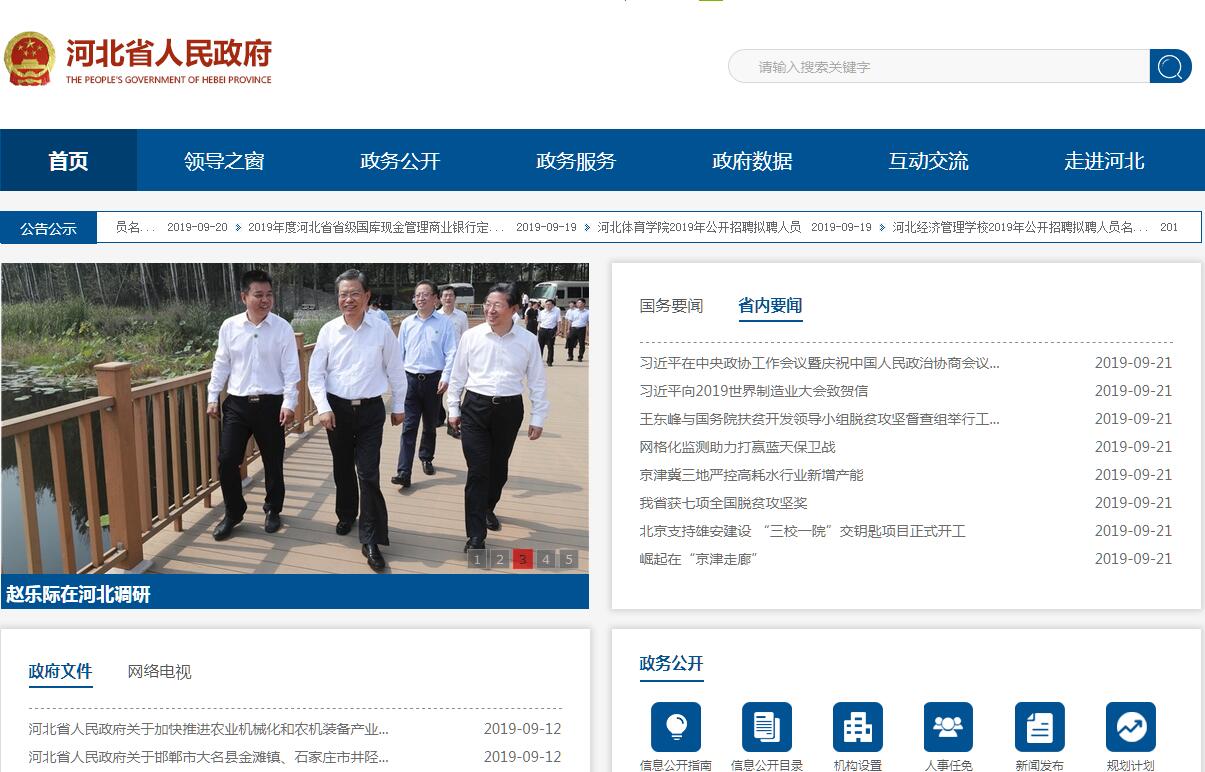 “中國河北”門戶網(wǎng)站是河北省人民政府在國際互聯(lián)網(wǎng)上建立的政府綜合門戶網(wǎng)站,是我省縣級(jí)以上政府及省政府各部門在國際互聯(lián)網(wǎng)上統(tǒng)一建立的網(wǎng)站群;是全省各級(jí)政府機(jī)關(guān)公用的信息綜合平臺(tái);是河北省電子政務(wù)建設(shè)的重要組成部分,是“數(shù)字河北”的重點(diǎn)工程之一?!爸袊颖薄遍T戶網(wǎng)站以“宣傳河北,服務(wù)社會(huì),溝通民眾,高效透明”為宗旨。“中國河北”的主要任務(wù)是宣傳黨和政府的方針政策,展示河北形象,推行政 務(wù)公開,及時(shí)發(fā)布政府信息,提供便民利民服務(wù)項(xiàng)目,加強(qiáng)政府與社會(huì)、政府與民眾的溝通,進(jìn)一步提高政府公共服務(wù)效率和質(zhì)量?!爸袊颖薄遍T戶網(wǎng)站主要設(shè)有走進(jìn)河北、信息公開、全省各地、部門信息、互動(dòng)交流、在線服務(wù)、專題專欄7大版塊?!爸袊颖薄遍T戶網(wǎng)站由河北省政府辦公廳主辦,河北省政府網(wǎng)站管理中心負(fù)責(zé)協(xié)調(diào)管理。河北省,簡稱“冀”,是中華人民共和國省級(jí)行政區(qū),省會(huì)石家莊。因位于黃河以北而得名。地處華北平原,東臨渤海、內(nèi)環(huán)京津,西為太行山,北為燕山,燕山以北為張北高原。下轄唐山、秦皇島、邯鄲、邢臺(tái)、保定、張家口、承德、滄州、廊坊、衡水等11個(gè)地級(jí)市,全省常住總?cè)丝?519.52萬(2017年),總面積18.88萬平方千米,是中國唯一兼有高原、山地、丘陵、盆地、平原、草原和海濱的省份,屬溫帶季風(fēng)氣候。河北是中華民族的發(fā)祥地之一,早在五千多年前,中華民族的三大始祖黃帝、炎帝和蚩尤就在河北由征戰(zhàn)到融合,開創(chuàng)了中華文明史。春秋戰(zhàn)國時(shí)期河北地屬燕國和趙國,故有“燕趙大地”之稱,漢代屬幽州、冀州。唐代為河北道,宋代為河北路,元代為中書省。明清屬直隸省。解放戰(zhàn)爭時(shí)期,河北西柏坡為中共中央臨時(shí)所在地。河北省擁有的省級(jí)以上文物保護(hù)單位達(dá)930處,居全國第一位。擁有長城、承德避暑山莊、清東陵和清西陵3項(xiàng)世界文化遺產(chǎn);邯鄲、保定、承德、正定、山海關(guān)、蔚縣6個(gè)國家級(jí)歷史文化名城。河北是萬里長城途經(jīng)距離最長、保存最完好的省份,境內(nèi)長城遺存達(dá)2000多公里。2015年7月31日,國際奧委會(huì)主席巴赫宣布北京攜手河北省張家口獲得2022年冬奧會(huì)舉辦權(quán)。河北省高速公路總里程7279公里,居全國第二位,唐山港、黃驊港、秦皇島港均躋身億噸大港行列。全省鐵路、公路貨物周轉(zhuǎn)量居中國大陸首位。2013年,京津冀一體化上升為重大國家戰(zhàn)略。2017年,河北省生產(chǎn)總值實(shí)現(xiàn)35964.0億元。