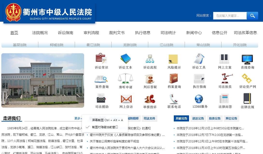 1985年8月24日,經(jīng)最高人民法院批準(zhǔn),成立衢州市中級人民法院,現(xiàn)下轄柯城、衢江、龍游、江山、常山、開化6個(gè)基層法院,12個(gè)人民法庭(柯城花園法庭,衢江廿里、杜澤法庭,龍游小南海、溪口、湖鎮(zhèn)法庭,江山峽口、賀村法庭,常山芳村、紅旗崗法庭,開化華埠、馬金法庭),市中院現(xiàn)有23個(gè)內(nèi)設(shè)部門,分別是:刑一庭、刑二庭、減刑假釋庭、民一庭、民二庭、民三庭、行政庭、執(zhí)行庭、執(zhí)行裁決庭、執(zhí)行綜合處、立案一庭、立案二庭、審監(jiān)庭、辦公室、研究室、監(jiān)察室、宣教處、人事處、司法鑒定處、法警支隊(duì)、行裝處、審判管理處、審判保障中心。全市法院現(xiàn)有在編政法干警612人,其中市中院現(xiàn)有在編政法干警117人。全市法院現(xiàn)有大學(xué)本科以上學(xué)歷531人,占干警總數(shù)的86.76%,碩士研究生學(xué)位72人,其中市中院具有碩士研究生學(xué)歷53人,占市中院在職干警總數(shù)的45.29%。近年來,全市法院緊緊圍繞經(jīng)濟(jì)社會發(fā)展大局,認(rèn)真履行審判職能,全力化解社會矛盾,積極參與社會管理,努力推進(jìn)公正司法,大力加強(qiáng)隊(duì)伍建設(shè),各項(xiàng)工作均取得新進(jìn)展。市中院先后榮獲黨風(fēng)廉政建設(shè)責(zé)任制優(yōu)秀單位、“平安衢州”建設(shè)先進(jìn)集體、陽光司法優(yōu)秀法院、學(xué)習(xí)型黨組織等榮譽(yù)稱號。衢江區(qū)法院、常山法院、江山法院先后被評為全省優(yōu)秀法院。市中院吳超英獲得“全國五一勞動獎?wù)隆?、被評為“全國法院辦案標(biāo)兵”,常山法院曹宏被評為全國優(yōu)秀法官,衢江區(qū)法院魏勝杰被評為全國法院先進(jìn)個(gè)人,開化法院汪秋喜被評為全國法院黨建工作先進(jìn)個(gè)人。