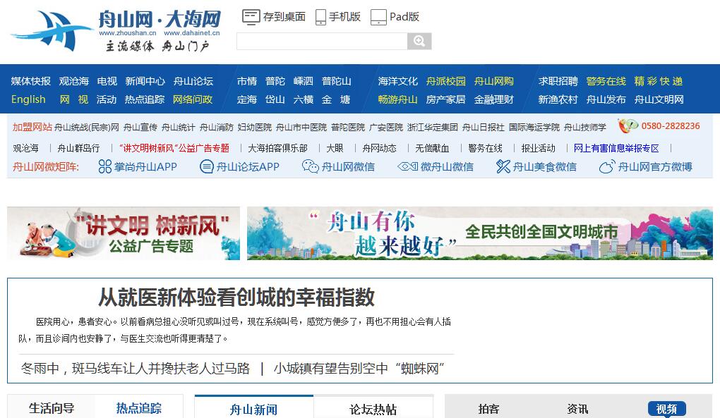 舟山網(wǎng)是浙江舟山群島新區(qū)以新聞宣傳為主的市級(jí)綜合性門戶網(wǎng)站,由舟山市委宣傳部、舟山日?qǐng)?bào)社和舟山廣播電視總臺(tái)聯(lián)辦,舟山日?qǐng)?bào)社承辦。機(jī)構(gòu)設(shè)有:舟山國(guó)際互聯(lián)網(wǎng)新聞中心,為自收自支事業(yè)單位,負(fù)責(zé)網(wǎng)站的新聞采編工作。舟山網(wǎng)絡(luò)傳媒有限公司,為國(guó)有全資公司,負(fù)責(zé)網(wǎng)站的經(jīng)營(yíng)工作。舟山網(wǎng)于2003年8月6日開通,2009年8月6日開始啟用“大海網(wǎng)”域名,與舟山網(wǎng)的域名同時(shí)使用,進(jìn)一步凸顯海洋信息傳播平臺(tái)特色。2005年、2008年分別與舟山移動(dòng)、舟山聯(lián)通、舟山電信合辦《舟山手機(jī)報(bào)》。2010年8月,建立了英語頻道,向海外宣傳舟山發(fā)展及海洋經(jīng)濟(jì)和人文類信息。近年來,舟山網(wǎng)圍繞“海洋特色、主流媒體、舟山門戶”的辦網(wǎng)目標(biāo),不斷開拓創(chuàng)新,積極探索特色辦網(wǎng)之路,以努力打造區(qū)域性門戶網(wǎng)站和海洋類門戶網(wǎng)站為目標(biāo),目前已成為浙江舟山群島新區(qū)影響力較大的綜合性門戶網(wǎng)站,并在全國(guó)海洋經(jīng)濟(jì)、海洋文化領(lǐng)域擁有了一定的知名度。同時(shí)通過改革網(wǎng)絡(luò)經(jīng)營(yíng)體制,拓展視頻等經(jīng)營(yíng)渠道,探索線上線下運(yùn)作,發(fā)展服務(wù)類頻道,新媒體產(chǎn)業(yè)保持快速增長(zhǎng)勢(shì)頭,走上了良性發(fā)展的道路。舟山網(wǎng)除了設(shè)有舟山新聞、網(wǎng)聞天下、觀淪海等新聞?lì)悪谀?,還設(shè)有暢游舟山、海洋文化、舟山美食、金融理財(cái)、房產(chǎn)家居、舟山網(wǎng)視等頻道,中國(guó)海洋文化在線等子網(wǎng)站,以及視頻訪談?lì)惞?jié)目藍(lán)色溝通、專題類欄目熱點(diǎn)追蹤等被市委宣傳部命名的品牌欄目。舟山網(wǎng)旗下的社區(qū)平臺(tái)舟山論壇,是舟山人氣最旺的主力論壇,日發(fā)帖量超過5000帖,注冊(cè)會(huì)員超過60萬,同時(shí)在線人數(shù)超過萬人,成為目前舟山網(wǎng)民理性討論交流、網(wǎng)民與政府良性互動(dòng),舟山影響力最大,融導(dǎo)向引導(dǎo)與服務(wù)為一體的主流論壇。同時(shí),為了更好地滿足舟山論壇手機(jī)用戶能夠隨時(shí)隨地享用舟山論壇內(nèi)容,正式推出了舟山論壇APP,為所有手機(jī)用戶提供便捷、高速、靈活的“掌中論壇”。舟山網(wǎng)還不斷強(qiáng)化服務(wù)功能,樹立用戶意識(shí),在首頁推出了網(wǎng)上舟山欄目,為網(wǎng)友提供天氣預(yù)報(bào)、水電費(fèi)、公積金、船班航期、公交線路、社保信息等的查詢,為網(wǎng)友提供第一手的便民服務(wù);舟山論壇推出了城市生活向?qū)跒榫W(wǎng)友提供最新最快的服務(wù)信息。近年來,舟山網(wǎng)在采編工作上收獲豐厚,榮獲浙江新聞獎(jiǎng)、舟山新聞獎(jiǎng)、中國(guó)地市報(bào)新聞獎(jiǎng)等近百個(gè)獎(jiǎng)項(xiàng)。中國(guó)海洋文化在線榮獲“浙江省文化傳播創(chuàng)新十佳網(wǎng)站”稱號(hào);《千人護(hù)千佛 慈航寶島行》獲中國(guó)城市網(wǎng)站聯(lián)盟精品獎(jiǎng);舟山論壇黨報(bào)在線欄目榮獲“首屆中國(guó)城市新聞網(wǎng)站品牌欄目?jī)?yōu)秀獎(jiǎng)”;“全國(guó)互聯(lián)網(wǎng)看舟山”活動(dòng)榮獲中國(guó)海洋文化節(jié)“海藍(lán)獎(jiǎng)”;《舟山市非物質(zhì)文化遺產(chǎn)網(wǎng)上展廳》(電子書)榮獲第二屆浙江省非物質(zhì)文化遺產(chǎn)宣傳報(bào)道“好專題”獎(jiǎng);《藍(lán)色溝通》榮獲2010——2011年度舟山市海洋文化精品名品獎(jiǎng)。舟山網(wǎng)團(tuán)支部被評(píng)為市級(jí)“青年文明號(hào)”,舟山網(wǎng)還榮獲舟山市宣傳工作先進(jìn)集體、舟山市新聞媒體宣傳人大制度先進(jìn)集體稱號(hào)。舟山網(wǎng)絡(luò)傳媒有限公司獲舟山市第二批海洋經(jīng)濟(jì)創(chuàng)新團(tuán)隊(duì)榮譽(yù),被評(píng)為首批舟山市成長(zhǎng)型文化企業(yè)。