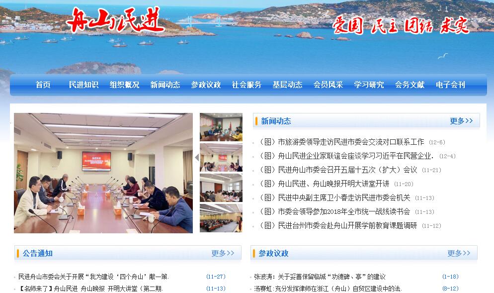 中國民主促進(jìn)會是以從事教育文化出版工作的高中級知識分子為主、具有政治聯(lián)盟性質(zhì)、致力于中國特色社會主義事業(yè)的政黨。舟山的民進(jìn)組織開始于1990年5月成立的民進(jìn)浙江省舟山市直屬小組,同年11月,升格為民進(jìn)浙江省舟山市直屬支部。1997年3月,民進(jìn)舟山市委會正式成立,至今產(chǎn)生了五屆委員會。第五屆市委會設(shè)市委委員11名,其中主任委員一名,副主任委員三名,現(xiàn)任主委為貝璐國。民進(jìn)舟山市委員會下轄市屬第一、新城、文教、醫(yī)衛(wèi)、定海、普陀6個支部;同時設(shè)海洋文化、教育教學(xué)、科技醫(yī)療和老齡工作4個專門工作委員會, 2014年8月成立舟山開明畫院。內(nèi)設(shè)機(jī)構(gòu)為辦公室。市委會機(jī)關(guān)刊物是《舟山民進(jìn)》。截至2016年底,共有會員131名,平均年齡54歲,其中女會員58人,離退休會員37人,中高級職稱會員118人。教育界占45.03%,政府機(jī)關(guān)占18.32%,醫(yī)衛(wèi)界占13.74%,公有制經(jīng)濟(jì)界占12.21%,另有會員系新的社會階層人士或分布在其他界別。會員中有省政協(xié)委員1人;市人大代表2人;市政協(xié)委員16人(其中,副主席1人,常委4人);區(qū)政協(xié)委員11人(其中,常委2人)。
