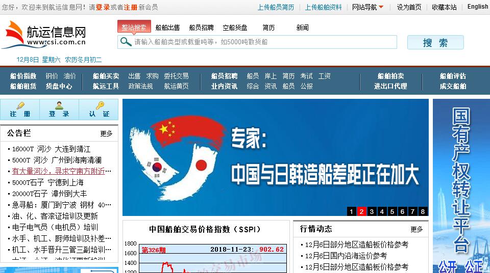 航運(yùn)信息網(wǎng)由浙江船舶交易市場(chǎng)主辦。浙江船舶交易市場(chǎng)有限公司(Zhejiang Shipping Exchange Market Co.,Ltd) 創(chuàng)辦于1998年6月,是一家專業(yè)為國(guó)內(nèi)外航運(yùn)業(yè)和船東提供船舶交易平臺(tái)及配套服務(wù)的國(guó)有企業(yè)。公司注冊(cè)資金1000萬(wàn)元。公司始終堅(jiān)持"奉獻(xiàn)船舶事業(yè)"的企業(yè)宗旨和"高效、創(chuàng)新、務(wù)實(shí)"的企業(yè)精神,遵循"公開、公平、公正、規(guī)范"的交易原則,內(nèi)抓管理,外拓市場(chǎng),經(jīng)過(guò)多年來(lái)的規(guī)范運(yùn)作,市場(chǎng)服務(wù)功能已覆蓋 船舶交易、船舶拍賣、國(guó)有產(chǎn)權(quán)轉(zhuǎn)讓、船舶評(píng)估、船舶設(shè)計(jì)、船舶勘驗(yàn)、船舶進(jìn)出口代理、船用技術(shù)咨詢、航運(yùn)信息和船價(jià)指數(shù)服務(wù)等。 公司創(chuàng)建的航運(yùn)類專業(yè)垂直網(wǎng)站航運(yùn)信息網(wǎng)www.csi.com.cn,搭建起網(wǎng)上無(wú)形市場(chǎng)和服務(wù)平臺(tái)。 公司的船舶交易和船舶貿(mào)易業(yè)務(wù)已輻射國(guó)內(nèi)外,年交易額超50億元,是國(guó)內(nèi)規(guī)模最大、年船舶交易額最多、服務(wù)功能最為完善的專業(yè)船舶交易市場(chǎng),并先后被命名為中國(guó)商品百?gòu)?qiáng)市場(chǎng)、交通運(yùn)輸部“十一五”信息化工作先進(jìn)單位、浙江省重點(diǎn)市場(chǎng)、浙江省服務(wù)業(yè)重點(diǎn)企業(yè)、浙江省文明單位、四星級(jí)文明規(guī)范市場(chǎng)等稱號(hào)。公司還對(duì)外投資組建了寧波市船舶交易市場(chǎng)、湖州船舶交易市場(chǎng)、海南船舶交易市場(chǎng)、大連東北亞國(guó)際航運(yùn)中心船舶交易市場(chǎng)、浙江易舸軟件有限公司、舟山易舸船舶拍賣公司和舟山港海通物流公司等7家控、參股企業(yè)。公司堅(jiān)持圍繞浙江“港航強(qiáng)省”的戰(zhàn)略和舟山“以港興市”的目標(biāo),立足浙江、面向全國(guó),依托自身品牌技術(shù)優(yōu)勢(shì),積極開拓埠市場(chǎng),加強(qiáng)同行間的合作與交流,打造國(guó)內(nèi)一流船舶交易平臺(tái),為推動(dòng)現(xiàn)代航運(yùn)業(yè)和船舶交易業(yè)的發(fā)展發(fā)揮更大的作用。