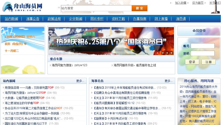 舟山海員網(wǎng)(www.zmsa.com.cn)是舟山海員管理協(xié)會的隸屬的為船員和航運企業(yè)搭建的一個公共服務(wù)平臺,是一個提供信息與咨詢的服務(wù)性網(wǎng)站,下設(shè)技術(shù)開發(fā)部、信息推廣部、商務(wù)部。舟山海員網(wǎng)成立于2005年12月,立足于為舟山海員、船企服務(wù)?,F(xiàn)有海事咨詢、就業(yè)動態(tài)、海員寶典、海員俱樂部、海員聯(lián)盟、會員風(fēng)采等具有濃重海味的欄目,并應(yīng)舟山航運市場和海事部門的要求,開通了船員證件網(wǎng)上電子申報、船員網(wǎng)上培訓(xùn)報名、短信互動、“邵老師熱線”、招聘求職、船員考試成績查詢、船員練練吧、航運信息系統(tǒng)、船舶視頻監(jiān)控等多個功能與平臺。為打造舟山海員品牌,建設(shè)舟山“誠信、公開、公平、公正”的海事環(huán)境提供支持。舟山海員網(wǎng)在船員和航運企業(yè)屆已經(jīng)深入人心,同時在舟山海事各項業(yè)務(wù)和社會服務(wù)中發(fā)揮了良好的作用。