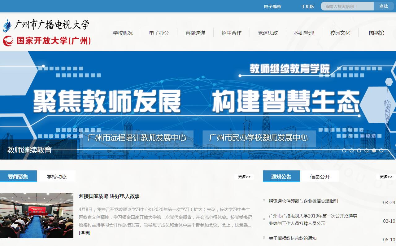 廣州市廣播電視大學(xué)創(chuàng)辦于1961年,是一所以現(xiàn)代信息技術(shù)為支撐,非學(xué)歷教育與學(xué)歷教育并舉,實(shí)施遠(yuǎn)程開放教育的新型高等學(xué)校。學(xué)校遵循“有教無類”的辦學(xué)理念,以增強(qiáng)自身發(fā)展和服務(wù)社會(huì)能力為宗旨,圍繞為中心城市經(jīng)濟(jì)社會(huì)建設(shè)培養(yǎng)應(yīng)用型人才為目標(biāo),積極開展非學(xué)歷繼續(xù)教育和學(xué)歷繼續(xù)教育。建校以來,共培養(yǎng)本??飘厴I(yè)生40余萬人,各類培訓(xùn)累計(jì)超過800萬人次,為推進(jìn)廣州高等教育大眾化進(jìn)程和培養(yǎng)社會(huì)亟需專門型人才作出了重要貢獻(xiàn)。學(xué)校被教育部授予“國家數(shù)字化學(xué)習(xí)資源中心廣州中心”、“終身學(xué)習(xí)公共服務(wù)平臺(tái)建設(shè)示范基地”,“國培計(jì)劃”遠(yuǎn)程培訓(xùn)機(jī)構(gòu),國家教育體制改革試點(diǎn)項(xiàng)目“推進(jìn)廣州學(xué)習(xí)型社會(huì)建設(shè)”的主體實(shí)施單位。廣州電大已成為廣州市民“家門口”的大學(xué),贏得了社會(huì)各界的廣泛贊譽(yù)。學(xué)校始終立足廣州、服務(wù)廣州,緊緊圍繞廣州經(jīng)濟(jì)社會(huì)發(fā)展和轉(zhuǎn)型升級(jí)全局,狠抓內(nèi)涵建設(shè),在人才培養(yǎng)模式、教學(xué)模式和管理模式等方面進(jìn)行積極探索,創(chuàng)造了以人為本、個(gè)性化的網(wǎng)絡(luò)學(xué)習(xí)環(huán)境,建成了廣州市覆蓋面最廣、學(xué)習(xí)人數(shù)最多的現(xiàn)代遠(yuǎn)程教育網(wǎng)絡(luò),為促進(jìn)教育公平、優(yōu)化我市高等教育結(jié)構(gòu)和層次布局作出了重要貢獻(xiàn)。廣州電大系統(tǒng)目前在讀各類本專科學(xué)生8萬余人,非學(xué)歷繼續(xù)教育年培訓(xùn)量80萬人次,在全市各區(qū)、各行業(yè)、企業(yè)單位建立了50余所分校,辦學(xué)規(guī)模與質(zhì)量在全國城市電大中名列前茅。近年來,學(xué)校立足向開放大學(xué)轉(zhuǎn)型發(fā)展的定位,通過加強(qiáng)學(xué)習(xí)環(huán)境建設(shè)、教學(xué)團(tuán)隊(duì)建設(shè)、特色專業(yè)建設(shè)、課程與資源建設(shè)、實(shí)踐基地建設(shè)、支持服務(wù)體系建設(shè),保持了教學(xué)基本建設(shè)與學(xué)校辦學(xué)事業(yè)的協(xié)調(diào)發(fā)展。學(xué)校受廣州市委組織部委托開展“羊城村官上大學(xué)”工程,全市8個(gè)區(qū)委組織部、電大共同組織開展農(nóng)村基層干部學(xué)歷教育,已有近5000名基層農(nóng)村干部成為大學(xué)生。承擔(dān)教育部、全國總工會(huì)農(nóng)民工“求學(xué)圓夢行動(dòng)”計(jì)劃,至2017年受惠企業(yè)職工已達(dá)9000余人學(xué)校主動(dòng)承擔(dān)構(gòu)建廣州終身教育體系和推進(jìn)廣州學(xué)習(xí)型城市建設(shè)的重任,積極開展社會(huì)公共教育支持服務(wù)實(shí)踐,加速發(fā)展“互聯(lián)網(wǎng)+”教育,打造廣州區(qū)域網(wǎng)絡(luò)遠(yuǎn)程教育品牌,為廣州構(gòu)建“人人皆學(xué)、時(shí)時(shí)能學(xué)、處處可學(xué)”的學(xué)習(xí)型社會(huì)作出了重要貢獻(xiàn)。作為教育部“中小學(xué)教師國家級(jí)培訓(xùn)計(jì)劃”遠(yuǎn)程培訓(xùn)機(jī)構(gòu),已先后承擔(dān)9省、市、自治區(qū)近3萬人“國培”任務(wù)。同時(shí)承擔(dān)廣州市中小學(xué)教師繼續(xù)教育每年70多萬人次在線繼續(xù)教育學(xué)習(xí)。在市委市政府的正確領(lǐng)導(dǎo)下,在國家開放大學(xué)、市教育局的大力支持下,學(xué)校將一如既往深入推進(jìn)戰(zhàn)略轉(zhuǎn)型和開放大學(xué)建設(shè),努力成為廣州學(xué)習(xí)型城市建設(shè)的重要實(shí)體和引領(lǐng)廣州終身教育的重要力量。