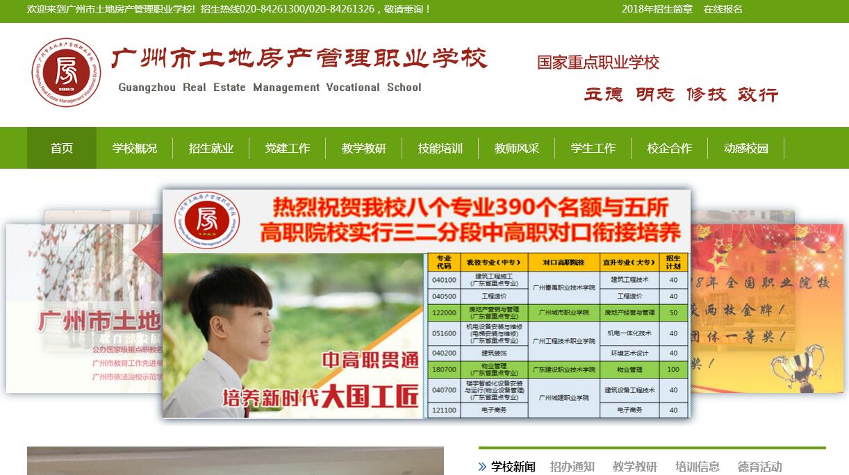 廣州市土地房產(chǎn)管理職業(yè)學(xué)校(廣州市房地產(chǎn)高級職業(yè)技術(shù)學(xué)校)是廣州市教育局屬下的一所全日制普通中等專業(yè)學(xué)校。原名廣州市房建中等專業(yè)學(xué)校,1963年創(chuàng)辦,2006年更名為現(xiàn)校名。1998年成為廣東省重點(diǎn)中職學(xué)校,2000年成為首批國家級重點(diǎn)中職學(xué)校。學(xué)校占地面積72.8畝,教學(xué)用房建筑面積5.6(4.55)萬平方米,辦學(xué)基礎(chǔ)設(shè)施設(shè)備完善,校園信息化建設(shè)程度高,獲得廣東省現(xiàn)代教育技術(shù)實(shí)驗(yàn)學(xué)校資格。校內(nèi)實(shí)訓(xùn)基地建筑面積2.5萬多平方米,設(shè)八個專業(yè)實(shí)訓(xùn)中心,其中電梯安裝與維修專業(yè)實(shí)訓(xùn)中心的建設(shè)規(guī)模與建設(shè)水平居省中職學(xué)校的先進(jìn)水平。學(xué)?,F(xiàn)有在編教工187人,合同制教工18人(其中專任教師132人、高級講師68人),教師中本科及本科以上學(xué)歷達(dá)100%。學(xué)校招生規(guī)模穩(wěn)定,目前在校生近3000人,職前職后培訓(xùn)鑒定年均4500多人次。近三年畢業(yè)生就業(yè)率均保持在97%以上。多年來,學(xué)校認(rèn)真落實(shí)黨和各級政府的職教政策,準(zhǔn)確把握中等職業(yè)教育定位,遵循職業(yè)教育規(guī)律,抓住職教大發(fā)展的機(jī)遇,堅(jiān)持內(nèi)涵發(fā)展,堅(jiān)持品牌立校,用專注之心和扎實(shí)之力辦職業(yè)教育;全體教工精誠團(tuán)結(jié),以愛心化解問題,以自信突破困難,以責(zé)任開創(chuàng)遠(yuǎn)景,不斷創(chuàng)新辦學(xué)模式和人才培養(yǎng)模式,不斷深化內(nèi)部管理體制改革和教育教學(xué)改革,在永不放棄的努力中,辦出了自己的特色和成效。學(xué)校的穩(wěn)定發(fā)展與改革成果,受到上級領(lǐng)導(dǎo)、教育同行和社會行業(yè)的關(guān)注和肯定,學(xué)校先后獲得“廣東省職業(yè)技術(shù)教育先進(jìn)集體”、“廣東省文明校園”、“廣州市文明示范校園”、“廣州市文明單位”、“廣州市教育工作先進(jìn)單位”、“廣州市安全文明單位”、“廣州市依法治校示范?!?、“廣州市治安內(nèi)保工作先進(jìn)單位”、“廣州市書香校園”、“廣東省書香校園”、“廣州市語言文字工作示范學(xué)?!?、“廣州市健康學(xué)校”等稱號和榮譽(yù)。