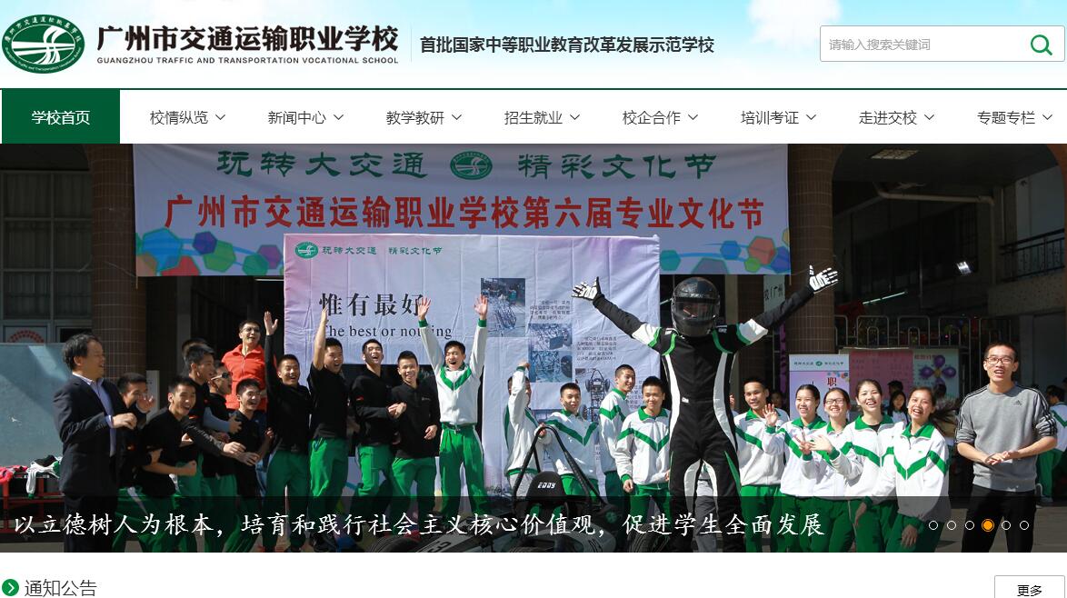 廣州市交通運輸職業(yè)學(xué)校創(chuàng)辦于1964年,是一所集職業(yè)教育與職業(yè)培訓(xùn)于一體,辦學(xué)特色突出的中等職業(yè)學(xué)校,是全國首批“國家中等職業(yè)教育改革發(fā)展示范學(xué)?!?。學(xué)校有嘉禾和廣園兩個校區(qū),占地面積49000平方米,建筑面積70000平方米。建有綜合實訓(xùn)中心,設(shè)有 6個校內(nèi)實訓(xùn)基地,實習(xí)實訓(xùn)設(shè)備總值9500萬元,可同時容納2500名學(xué)生實訓(xùn)。學(xué)校立足于為珠江三角洲地區(qū)交通運輸行業(yè)發(fā)展服務(wù),構(gòu)建起汽車制造、汽車維修、交通運輸與物流管理、城市軌道交通和城市燃氣工程五大專業(yè)群,共開設(shè)12個專業(yè),其中國家級示范專業(yè)1個,省級重點專業(yè)4個?,F(xiàn)有全日制在校生5800人,畢業(yè)生就業(yè)率保持在98%以上,其中70%以上的畢業(yè)生進入高端企業(yè)就業(yè),學(xué)校成為珠三角地區(qū)交通運輸行業(yè)重要的技術(shù)技能人才培養(yǎng)基地。學(xué)校積極與行業(yè)協(xié)會合作,開展汽車維修、營運駕駛等從業(yè)資格培訓(xùn)考核和各類企業(yè)專項培訓(xùn),職業(yè)培訓(xùn)年均達2萬多人次,成為珠三角地區(qū)交通運輸行業(yè)重要的企業(yè)員工培訓(xùn)基地。學(xué)校積極推進產(chǎn)教融合、校企合作,先后與豐田、上海通用、東風(fēng)雪鐵龍、奔馳、一汽大眾、一汽奧迪、廣汽集團、港華煤氣、廣日電梯等30多家企業(yè)開展深層次合作,共同培養(yǎng)技術(shù)技能人才,并與250多個企業(yè)緊密聯(lián)系,各專業(yè)均建立起穩(wěn)定的頂崗實習(xí)基地。同時,學(xué)校與德國、英國等相關(guān)院校和培訓(xùn)機構(gòu)開展國際合作交流,與2所高職院校合作,中高職有機銜接,分段培養(yǎng)技術(shù)技能人才。學(xué)校近十年來持續(xù)推進教育教學(xué)改革,率先構(gòu)建起工學(xué)結(jié)合課程體系并實施一體化教學(xué),并針對學(xué)生就業(yè)及升學(xué)需求所帶來的人才規(guī)格差異實施“分層次、多形式”的人才培養(yǎng)模式,該教學(xué)成果分別獲得2014年國家級教學(xué)成果獎一等獎、二等獎。近五年,學(xué)校先后獲得“全國教育系統(tǒng)先進集體”、“全國中等職業(yè)學(xué)校德育工作先進集體”、“廣州市先進集體”、“廣東省先進集體”“廣東省依法治校示范學(xué)校”等榮譽。