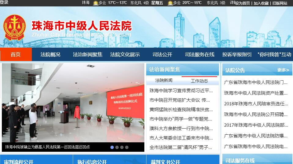 珠海市中級人民法院成立于1980年6月,現(xiàn)轄橫琴新區(qū)人民法院、香洲區(qū)人民法院、斗門區(qū)人民法院和金灣區(qū)人民法院,內(nèi)設監(jiān)察室、政治處、執(zhí)行局、破產(chǎn)審判庭(執(zhí)行裁判庭)、知識產(chǎn)權(quán)法庭、辦公室、審判管理辦公室、立案庭、刑事審判第一庭、刑事審判第二庭、民事審判第一庭、民事審判第二庭、民事審判第三庭、民事審判第四庭、行政審判庭、城市管理審判庭、國家賠償委員會辦公室、審判監(jiān)督庭、研究室、宣傳科、司法行政裝備科等21個內(nèi)設機構(gòu)。截至2017年10月,全市兩級法院總?cè)藬?shù)1010人,在編人數(shù)504人,員額法官人數(shù)229人,其中市中院員額法官人數(shù)60人。建院初期,全市法院收案數(shù)量不多,隨著改革開放的深入,辦案任務日益繁重,近年來以每年20%左右的增長率攀升。2016年受理案件數(shù)已超5萬件,員額法官人均辦案數(shù)達258件。近年來,全市法院以爭創(chuàng)全國一流法院為統(tǒng)攬,狠抓審判執(zhí)行、改革創(chuàng)新、隊伍建設,各項工作不斷開創(chuàng)新局面。司法改革試點穩(wěn)步推進,完成法官員額制改革,搭建審判團隊,實行人員分類管理;取消審批制,實行審判權(quán)運行機制改革,落實司法責任制,基本實現(xiàn)“讓審理者裁判,由裁判者負責”;橫琴新區(qū)法院綜合改革為全國提供可復制、可推廣的經(jīng)驗;全力打造執(zhí)行指揮中心智能化系統(tǒng)、訴訟服務中心兩個全國法院示范品牌;全國首家中院知識產(chǎn)權(quán)派出法庭,全國家事審判試點改革,全國首批人民陪審員制度改革試點,設立破產(chǎn)執(zhí)行庭、環(huán)境資源合議庭,一審涉外民商事案件集中管轄,行政案件集中管轄、異地審理等改革舉措不斷完善、深化、推廣。五年來,珠海中院被廣東省省委授予“廣東省依法治省工作先進單位”榮譽稱號,被最高人民法院確定為全國司法公開示范法院、全國法院文化建設示范單位。全市法院涌現(xiàn)出全國模范法院、全國法院先進集體、全國法院司法統(tǒng)計工作先進集體、全國法院辦案標兵、全國法院司法警察先進個人等一批先進集體和個人。黨的十九大指出,中國特色社會主義進入了新時代。站在新的歷史起跑線上,我們又有新的目標,新的使命,新的機遇,新的挑戰(zhàn)。展望未來,我們信心百倍。我們將以新時代中國特色社會主義思想為統(tǒng)領,認真汲取歷史營養(yǎng),求真務實,開拓進取,建設一支政治強、業(yè)務精、為黨和人民所信賴的法官隊伍,走一條新時期人民法院公正、權(quán)威、高效之路,力爭在法治建設史上寫下精彩一頁!