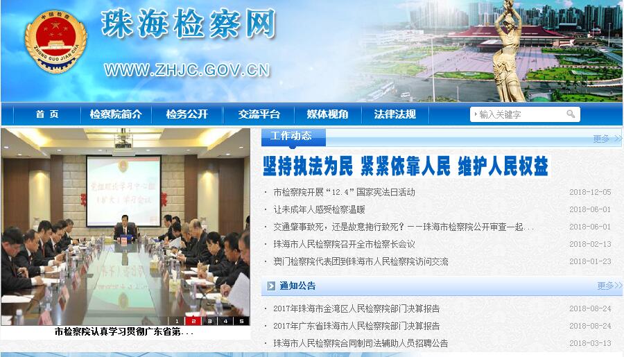 珠海市位于南海之濱,廣東省西南部,因處于珠江注入南海之處而得名,東與香港、深圳隔海相望,南與澳門相連,西鄰江門,北與中山市接壤。珠海依山臨海,環(huán)境優(yōu)美,素有“百島之市”美譽,曾先后榮獲聯(lián)合國人居中心頒發(fā)的“改善人類居住環(huán)境最佳范例獎”和國家有關(guān)部門授予的“國家環(huán)境保護模范城”、“中國旅游勝地40佳”、“中國精神文明建設(shè)十佳城市”、“中國十大最具幸福感城市”等稱號。珠海市人民檢察院坐落于珠海市香洲區(qū)。1955年12月1日,珠??h人民檢察院正式成立,隸屬于廣東省人民檢察院佛山地區(qū)分院,院址設(shè)在珠??h唐家鎮(zhèn)。 1958年并入中山縣人民檢察院。1961年恢復(fù)珠??h人民檢察院,1967年因文化大革命而被撤銷,1978年恢復(fù)重建。1979年3月5日,根據(jù)國務(wù)院的有關(guān)批文,珠海市人民檢察院(縣級)正式成立,內(nèi)設(shè)七個科室,院址設(shè)在香洲區(qū)康寧路33號8號樓。1979年11月26日,珠海市由原屬廣東省和佛山 地區(qū)雙重領(lǐng)導(dǎo)改為直屬廣東省領(lǐng)導(dǎo),成為地區(qū)一級的省轄市。珠海市人民檢察院因此升格為地市級檢察院。1985年初,珠海市人民檢察院遷入光明街97號。 1999年2月8日,遷至現(xiàn)址至香洲區(qū)香華路166號。截至2018年6月,珠海市人民檢察院下轄香洲、金灣、斗門3個基層檢察院以及橫琴新區(qū)檢察院、高新區(qū)知識產(chǎn)權(quán)檢察室、派駐高欄港經(jīng)濟區(qū)檢察室等3個派出機構(gòu),設(shè)政治處1個職能機構(gòu)和15個內(nèi)設(shè)機構(gòu)、1個直屬機構(gòu)及1個事業(yè)單位,共有工作人員227人,其中政法專項編制公務(wù)員156人,職工17人,事業(yè)編制2人,職員36人,合同制司法輔助人員16人。