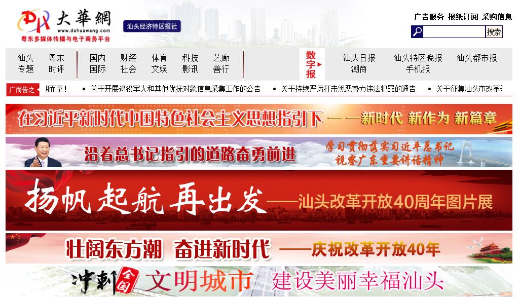 大華網(wǎng)(www.dahuawang.com)是汕頭經(jīng)濟特區(qū)報社創(chuàng)建于1999年8月的媒體網(wǎng)站,汕頭媒體的新品牌,粵東地區(qū)目前較有影響力的新聞和信息門戶網(wǎng)。大華網(wǎng)與報社傳統(tǒng)報刊結(jié)合互動,“報”出繽紛,“網(wǎng)”羅精彩。多年來,突出本地新聞特色,全面準確地報道了汕頭社會經(jīng)濟發(fā)展情況,展示了汕頭加快發(fā)展的嶄新形象;突出區(qū)域中心特色,著力構(gòu)建“粵東連線”、“今日汕頭”、“汕臺之間”等對外宣傳網(wǎng)上平臺,成為宣傳汕頭經(jīng)濟特區(qū)的重要陣地和窗口;突出地方文化特色,以“潮人網(wǎng)”聯(lián)結(jié)海內(nèi)外潮人情誼,傳承弘揚優(yōu)秀潮汕歷史文化,深受海內(nèi)外潮人的關(guān)注和歡迎。大華網(wǎng)開設(shè)多個新聞和信息資訊頻道,提供及時、精彩、豐富的新媒體新聞資訊的同時,出版《汕頭日報》、《汕頭特區(qū)晚報》、《汕頭都市報》、《潮商》等數(shù)字報刊,精心打造“汕頭手機報”等新媒體載體,致力搭建網(wǎng)民與報網(wǎng)媒體良性溝通交流的互動平臺,“每天都有新發(fā)現(xiàn)”,以最新的資訊、最快的傳播、最熱的互動,報道汕頭,輻射粵東,聯(lián)結(jié)潮人。2005年,曾被評為“汕頭市十佳網(wǎng)站”。大華網(wǎng)歷經(jīng)十年發(fā)展正在實現(xiàn)全新的跨越。未來幾年將抓住“數(shù)字革命”和新媒體迅猛發(fā)展帶來的機遇,加快建設(shè)在汕頭乃至粵東有影響的既能提供時事新聞、生活資訊、互動平臺,又擁有廣告推廣、電子商務(wù)等數(shù)字內(nèi)容和各種增值服務(wù)的城市綜合信息門戶網(wǎng)站。