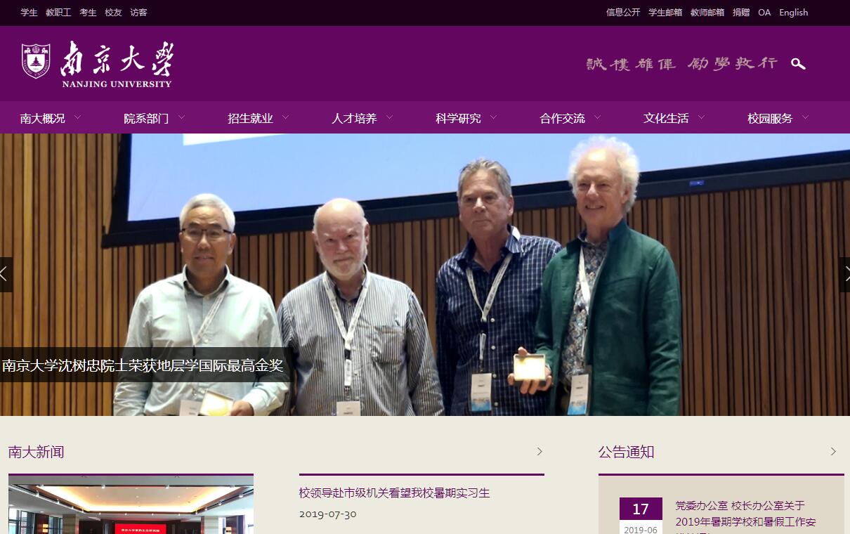 南京大學坐落于鐘靈毓秀、虎踞龍蟠的金陵古都,是一所歷史悠久、聲譽卓著的百年名校。其前身是創(chuàng)建于1902年的三江師范學堂,此后歷經兩江師范學堂、南京高等師范學校、國立東南大學、第四中山大學、國立中央大學、國立南京大學等歷史時期,于1950年更名為南京大學。1952年,在全國高校院系調整中,南京大學調整出工學、農學、師范等部分院系后與創(chuàng)辦于1888年的金陵大學文、理學院等合并,仍名南京大學。校址從四牌樓遷至鼓樓金大原址。在一個多世紀的辦學歷程中,南京大學及其前身與時代同呼吸、與民族共命運,謀國家之強盛、求科學之進步,為國家的富強和民族的振興做出了重要的貢獻。尤其是改革開放以來,作為教育部直屬的重點綜合性大學,南京大學又在嶄新的歷史機遇中煥發(fā)出新的生機,在教學、科研和社會服務等各個領域保持良好的發(fā)展態(tài)勢,各項辦學指標和綜合實力均位居全國高校前列。1994年,南京大學被確定為國家“211工程”重點支持的大學;1999年,南京大學進入國家“985工程”首批重點建設的高水平大學行列;2006年,教育部和江蘇省再次簽訂重點共建南京大學的協(xié)議;2011年,教育部和江蘇省簽署協(xié)議繼續(xù)重點共建南京大學;2016年,南京大學入選首批國家級雙創(chuàng)示范基地;2017年,南京大學入選A類世界一流大學建設高校名單,15個學科入選世界一流學科建設名單。南京大學目前擁有仙林、鼓樓、浦口三個校區(qū),有29個直屬院系,各類學生總計34580人,其中本科生13196人、碩士研究生12195人、博士研究生6036人、外國留學生3153人。全校設本科專業(yè)86個,專業(yè)碩士學位授權點24個,專業(yè)博士學位授權點1個,碩士學位授權一級學科10個,碩士學位授權二級學科點(不含一級學科覆蓋點)6個,博士學位授權一級學科41個,博士學位授權二級學科點(不含一級學科覆蓋點)2個,博士后流動站38個,國家級人才培養(yǎng)基地12個;有一級學科國家重點學科8個,二級學科國家重點學科13個,江蘇高校優(yōu)勢學科建設工程二期項目立項學科與重點序列學科20個;有國家實驗室(籌)1個,國家級2011協(xié)同創(chuàng)新中心2個,國家重點實驗室7個,教育部重點實驗室8個,江蘇高校協(xié)同創(chuàng)新中心5個,江蘇省重點(工程)實驗室10個,國家工程技術研究中心1個,國家地方聯(lián)合工程研究中心1個,教育部工程中心2個,環(huán)境保護部工程技術研究中心1個,國防科工局國防重點學科實驗室1個,國家測繪地理信息局重點實驗室1個,江蘇省工程中心10個,教育部人文社會科學重點研究基地4個,國家高端智庫建設培育單位1個。學校擁有一支高素質的師資隊伍,其中包括中國科學院院士29人,中國工程院院士3人,中國科學院外籍院士1人,第三世界科學院院士4人,俄羅斯科學院院士1人,加拿大皇家科學院院士1人,“千人計劃”創(chuàng)新人才31人、創(chuàng)業(yè)人才14人、“外專千人計劃”入選者4人,“萬人計劃”科技創(chuàng)新領軍人才10人、哲學社會科學領軍人才3人、百千萬工程領軍人才2人、教學名師2人,教育部“長江學者獎勵計劃”特聘教授97人、講座教授25人,國家杰出青年基金獲得者117人,國家級教學名師10人,國務院學位委員會學科評議組成員22人,國家級有突出貢獻的中青年科學、技術、管理專家27人,國家重點研發(fā)計劃、國家科技重大專項、重大科學研究計劃、“973計劃”、863計劃等重大項目首席科學家76人次,“青年千人計劃”入選者113人,“萬人計劃”青年拔尖人才8人,教育部“新世紀優(yōu)秀人才支持計劃”入選者238人,“百千萬人才工程”國家級人選34人。春風化雨、桃李芬芳。在過去的一個多世紀中,南京大學始終堅持育人為本,在各個歷史階段培養(yǎng)和造就了眾多中華英才,他們在各自的領域建功立業(yè)、成就卓著。改革開放以來,南京大學在教育教學改革中進行了多方面的探索,形成了許多重要的教育思想和教學理念,在國內外高等教育界產生了重要的影響。當前,南京大學提出了“辦中國最好的本科教育”的奮斗目標,堅持“學科建設與本科教學融通,通識教育與個性化培養(yǎng)融通,拓寬基礎與強化實踐融通,學會學習與學會做人融通” 的人才培養(yǎng)理念,不斷深化創(chuàng)新人才培養(yǎng)機制改革,積極為社會各行各業(yè)培養(yǎng)具有創(chuàng)新精神、實踐能力和國際視野的未來領軍人才和拔尖創(chuàng)新人才。南京大學的前身即“以科學名世”,格物致知、追求真理的科學精神和傳統(tǒng)始終貫穿于南京大學的發(fā)展史中,成為南京大學辦學最重要的特色。一代又一代的南大人孜孜求索、攀高攻堅、為國爭光、為民造福,涌現(xiàn)出一大批優(yōu)秀的科研成果,蜚聲國內外學界。今日南京大學以“加強應用、注重基礎、發(fā)展邊緣、促進聯(lián)合”為方針,以“基礎研究面向國際學術前沿,應用研究面向國家戰(zhàn)略需求和國民經濟建設主戰(zhàn)場、致力于解決關系國計民生的重大理論和現(xiàn)實問題”為指導思想,調整科研布局、加強科研組織,整體提高原創(chuàng)科研能力與水平,將南京大學建成我國重要的科學研究中心。自上個世紀初建校以來,南京大學就一直是開展國際交流與合作最活躍的中國大學之一,與世界上眾多一流大學和高水平科研機構建立了緊密的