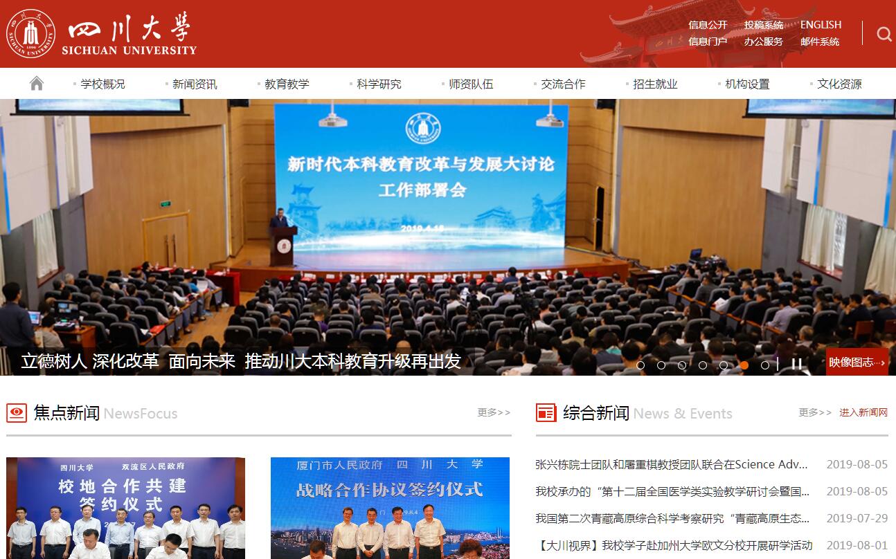 岷峨挺秀,錦水含章。巍巍學(xué)府,德渥群芳。四川大學(xué)是教育部直屬全國重點大學(xué),是國家布局在中國西部的重點建設(shè)的高水平研究型綜合大學(xué)。四川大學(xué)地處中國歷史文化名城——“天府之國”的成都,有望江、華西和江安三個校區(qū),占地面積7050畝,校舍建筑面積256.3萬平方米。校園環(huán)境幽雅、花木繁茂、碧草如茵、景色宜人,是讀書治學(xué)的理想園地。四川大學(xué)由原四川大學(xué)、原成都科技大學(xué)、原華西醫(yī)科大學(xué)三所全國重點大學(xué)經(jīng)過兩次合并而成。原四川大學(xué)起始于1896年四川總督鹿傳霖奉光緒特旨創(chuàng)辦的四川中西學(xué)堂,是西南地區(qū)最早的近代高等學(xué)校;原成都科技大學(xué)是新中國院系調(diào)整時組建的第一批多科型工科院校;原華西醫(yī)科大學(xué)源于1910年由西方基督教會組織在成都創(chuàng)辦的華西協(xié)合大學(xué),是西南地區(qū)最早的西式大學(xué)和國內(nèi)最早培養(yǎng)研究生的大學(xué)之一。1994年,原四川大學(xué)和原成都科技大學(xué)合并為四川聯(lián)合大學(xué),1998年更名為四川大學(xué),江澤民、李鵬等黨和國家領(lǐng)導(dǎo)人就兩校合并為學(xué)校題詞并寄予深切厚望。2000年,四川大學(xué)與原華西醫(yī)科大學(xué)合并,組建了新的四川大學(xué)。李嵐清同志在考察新四川大學(xué)時說:“四川大學(xué)是我們改革最早的大學(xué),對我國高校的改革做出了歷史性的貢獻,可以說是高校體制改革的先鋒?!痹?008年“5·12”汶川特大地震抗震救災(zāi)期間,吳邦國、溫家寶等黨和國家領(lǐng)導(dǎo)人先后到四川大學(xué)視察慰問。2016年,李克強總理來校視察,勉勵川大要為全國“雙創(chuàng)”帶頭,多出世界一流學(xué)科。 四川大學(xué)承文翁之教,聚群賢英才。百余年來,學(xué)校先后匯聚了歷史學(xué)家顧頡剛、文學(xué)家李劼人、美學(xué)家朱光潛、物理學(xué)家吳大猷、植物學(xué)家方文培、衛(wèi)生學(xué)家陳志潛、數(shù)學(xué)家柯召等大師。歷史上,吳玉章、張瀾曾執(zhí)掌校務(wù),共和國開國元勛朱德、共和國主席楊尚昆、文壇巨匠郭沫若、人民作家巴金、一代英烈江竹筠(江姐)等曾在川大求學(xué)。中國科學(xué)院和中國工程院院士中,有64位是川大校友;2001年評選的近代50位“四川文化名人”中,有36人是川大校友。四川大學(xué)學(xué)科門類齊全,覆蓋了文、理、工、醫(yī)、經(jīng)、管、法、史、哲、農(nóng)、教、藝等12個門類,有34個學(xué)科型學(xué)院及研究生院、海外教育學(xué)院等學(xué)院?,F(xiàn)有博士學(xué)位授權(quán)一級學(xué)科45個,專業(yè)學(xué)位授權(quán)點32個,本科專業(yè)142個,博士后流動站37個,國家重點學(xué)科46個,國家重點培育學(xué)科4個,是國家首批工程博士培養(yǎng)單位。截至2017年底,學(xué)校進入ESI排名全球前1%的學(xué)科領(lǐng)域14個,其中,化學(xué)、材料科學(xué)學(xué)科領(lǐng)域進入全球前1‰。四川大學(xué)大師云集,名師薈萃。截至2017年底,學(xué)校有專任教師5494人,具有正高級職稱的1733人。學(xué)校有中國科學(xué)院和中國工程院院士15人,四川大學(xué)杰出教授5人,國家“千人計劃”創(chuàng)新長期項目入選者15人、創(chuàng)新短期項目入選者17人、外專項目入選者4人,教育部“長江學(xué)者獎勵計劃”特聘教授43人、講座教授16人,國家“萬人計劃”領(lǐng)軍人才14人,國家自然科學(xué)杰出青年基金獲得者50人,“四青”人才(國家“千人計劃”青年項目入選者、教育部“長江學(xué)者獎勵計劃”青年項目入選者、國家“萬人計劃”青年拔尖人才、國家自然科學(xué)優(yōu)秀青年基金獲得者)104人次,“973”首席科學(xué)家9人,牽頭“973”重大基礎(chǔ)研究項目12項,重點研發(fā)計劃項目負責(zé)人30人,國家社科基金重大招標(biāo)(委托)項目獲得者39人(42項),國家教學(xué)名師獎獲得者12人,國家創(chuàng)新人才推進計劃“中青年科技創(chuàng)新領(lǐng)軍人才”15人,四川省“千人計劃”(含原省“百人計劃”)入選者123人。四川大學(xué)在長期的辦學(xué)歷程中,形成了深厚的人文底蘊、扎實的辦學(xué)基礎(chǔ)和以校訓(xùn)“海納百川,有容乃大”、校風(fēng)“嚴謹、勤奮、求是、創(chuàng)新”為核心的川大精神。近年來,學(xué)校圍繞創(chuàng)建一流研究型綜合大學(xué)的奮斗目標(biāo),確立了“以人為本,崇尚學(xué)術(shù),追求卓越”的現(xiàn)代大學(xué)辦學(xué)理念,建立了“以院系為管理重心,以教師為辦學(xué)主體,以學(xué)生為育人中心”的管理運行新機制,提出了“精英教育、質(zhì)量為本、科教結(jié)合、學(xué)科交叉”的人才培養(yǎng)指導(dǎo)思想,確立了培養(yǎng)“具有深厚人文底蘊、扎實專業(yè)知識、強烈創(chuàng)新意識、寬廣國際視野的國家棟梁和社會精英”的人才培養(yǎng)目標(biāo),探索構(gòu)建了體現(xiàn)精英教育、個性化教育、全面發(fā)展教育的本科“323+X”創(chuàng)新人才培養(yǎng)體系。學(xué)校持續(xù)推進“探究式、小班化”課堂教學(xué)改革,連續(xù)成功舉辦6屆“國際課程周”。2003年以來,學(xué)校獲得國家教學(xué)成果獎31項、國家精品課程33門,國家級精品視頻公開課12門、精品資源