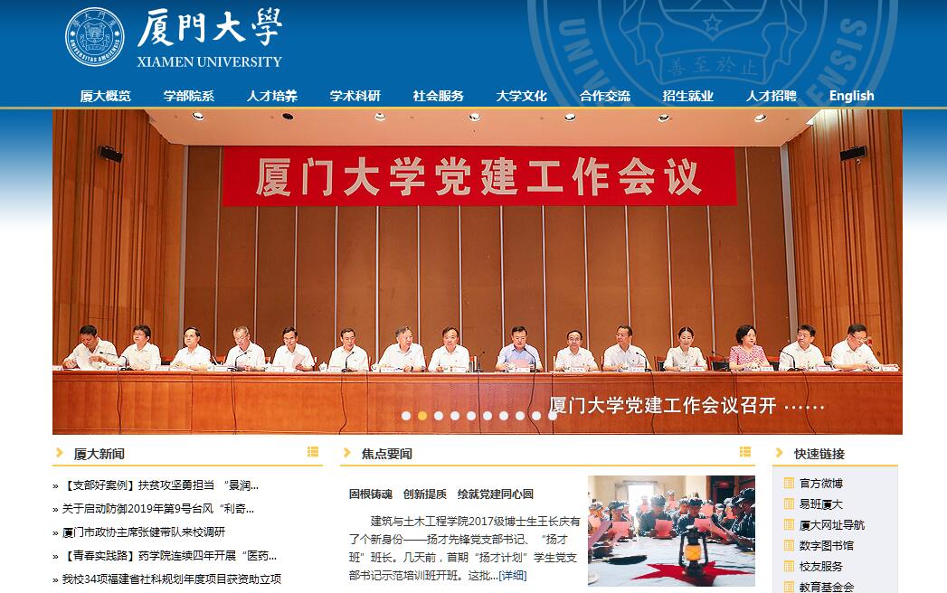 廈門大學(Xiamen University),簡稱廈大(XMU),由著名愛國華僑領袖陳嘉庚先生于1921年創(chuàng)辦,是中國近代教育史上第一所華僑創(chuàng)辦的大學,也是國家“211工程”和“985工程”重點建設的高水平大學。2017年,廈門大學入選國家公布的A類世界一流大學建設高校名單。建校以來,學校秉承“自強不息,止于至善”的校訓,積累了豐富的辦學經驗,形成了鮮明的辦學特色,成為一所學科門類齊全、師資力量雄厚、居國內一流、在國際上有廣泛影響的綜合性大學。建校迄今,已先后為國家培養(yǎng)了30多萬名本科生和研究生,在廈大學習、工作過的兩院院士達60多人。學校設有研究生院、6個學部以及28個學院(含88個系)和14個研究院,形成了包括人文科學、社會科學、自然科學、工程與技術科學、管理科學、藝術科學、醫(yī)學科學等學科門類在內的完備學科體系。學?,F(xiàn)有12個學科進入ESI全球前1%,擁有5個一級學科國家重點學科、9個二級學科國家重點學科、17個一級學科福建省特色重點學科、46個福建省一級學科重點學科,9個國家基礎科學人才培養(yǎng)基地。擁有31個博士后流動站;33個博士學位授權一級學科,3個博士學位授權二級學科;52個碩士學位授權一級學科,3個碩士學位授權二級學科;9個交叉學科;1個博士專業(yè)學位學科授權,24個碩士專業(yè)學位學科授權。2017年,化學、海洋科學、生物學、生態(tài)學、統(tǒng)計學5個學科入選國家公布的世界一流學科建設名單。學?,F(xiàn)有專任教師2657人,其中,教授、副教授1875人,占專任教師總數(shù)的70.6%(下同),擁有博士學位的2154人,占81.1%。學校共有兩院院士22人(含雙聘院士9人),文科資深教授2人,國家重點基礎研究發(fā)展計劃(簡稱973計劃,含重大科學研究計劃)首席科學家10人次,海外高層次人才引進計劃(簡稱國家“千人計劃”)入選者82人(含“千人計劃”青年人才47人),“長江學者獎勵計劃”特聘教授24人、講座教授16人、青年學者4人,國家杰出青年科學基金獲得者41人,國家級教學名師6人,國家高層次人才特殊支持計劃(簡稱“萬人計劃”)科技創(chuàng)新領軍人才13人、哲學社會科學領軍人才5人、教學名師1人、百千萬工程領軍人才2人、青年拔尖人才9人,國家“百千萬人才工程”入選者20人,教育部“新(跨)世紀優(yōu)秀人才培養(yǎng)計劃”入選者138人,國家優(yōu)秀青年科學基金獲得者29人;國家創(chuàng)新研究群體8個、教育部創(chuàng)新團隊9個。學?,F(xiàn)有在校學生近40000人(含外國學歷留學生1437人),其中本科生20045人、碩士研究生16172人、博士研究生3647人,本研比約為1:1。學校獲第五、六、七屆國家級高等教育教學成果一等獎3項、二等獎17項,名列全國高校前茅;30門課程入選全國“精品課程”,6個國家級實驗教學示范中心,3個國家級虛擬仿真實驗教學中心,6個國家級大學生校外實踐教育基地。12篇論文入選“全國百篇優(yōu)秀博士學位論文”。廈大畢業(yè)生是最受社會歡迎的群體之一,年均就業(yè)率保持在95%以上。學校設有200多個研究機構,其中國家級協(xié)同創(chuàng)新中心2個(牽頭單位),國家重點實驗室4個,國家工程技術研究中心1個,國家工程實驗室1個,國家地方聯(lián)合工程研究中心1個,國家地方聯(lián)合工程實驗室3個,教育部重點實驗室5個,教育部工程研究中心3個,教育部人文社科重點研究基地5個。廈門大學國家大學科技園是福建省內僅有的兩個經科技部、教育部認定的國家級大學科技園之一。“十二五”期間,學校自然科學科研實力大幅提升,在《科學》、《自然》、《細胞》及其子刊等國際高水平學術期刊上發(fā)表論文50余篇;獲國家自然科學二等獎4項、國際科學技術合作獎1項;1項成果入選“中國科學十大進展”,2項成果入選“中國高校十大科技進展”,1項成果獲中國專利金獎。學校人文社會學科研究實力雄厚,“十二五”期間共承擔國家社科基金重大項目17項,教育部哲社研究重大課題攻關項目10項;32項成果獲教育部第六屆、第七屆高等學??茖W研究優(yōu)秀成果獎(人文社會科學),其中一等獎3項;廈門大學在臺灣研究、南洋研究、高教研究、經濟研究、會計研究、南海研究等領域已經形成自身特色,實力居國內高校前列。2017年,學??蒲薪涃M14億元。學校對外交流與合作深入開展,已與境外300多所高校簽署了校際合作協(xié)議,與近50所世界排名前200名的高校開展實質性交流合作。積極參與漢語國際推廣工作,已與北美洲、歐洲、亞洲、非洲等地區(qū)的大學合作建立了16所孔子學院,并獲批建設“孔子學院院長學院”。在對臺交流方面,學校具有得天獨厚的地理條件和難以替代的人文優(yōu)勢,已成為臺灣研究的重鎮(zhèn)和兩岸學術、文化交流的前沿。2014年7月,廈門大學馬來西亞分校奠基,成為中國首個在海外建設獨立校園的大學;2016年2月,分校舉行首批新生開學典禮;分校現(xiàn)已開設13個專業(yè),有在校生2800余人、教職員工216人,獲準設立“福建省政府獎學金”。廈門大學馬來西亞分校被中央媒體譽為鑲嵌在“一帶一路”上的一顆明珠,并寫入中馬聯(lián)合新聞聲明。2017年金磚國家領導人廈門會晤期間,廈門大學成功舉辦“美好青春我做主”艾滋病防治宣傳校園行——走進廈門大學活動與第二屆聯(lián)合國教科文組織女童和婦女教育獎頒獎儀式,展示中國形象、福建